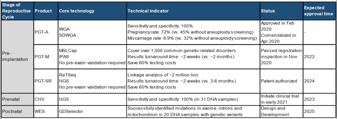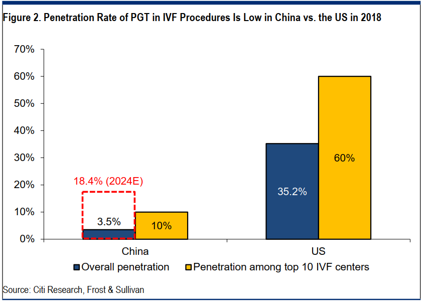 | 近日,花旗发布了关于贝康医疗(2170.HK)的研究报告,花旗认为公司拥有第三代试管婴儿基因检测试剂盒注册许可证,已为中国80家体外受精医院/中心中的42家提供体外受精治疗中的PGT服务。预计2024年中国胚胎植入前基因检测产品(PGT)服务市场规模将达到120亿元人民币,复合年增长率为61%(2019-2024E)。并且,2018年,中国体外受精程序中PGT的普及率为3.5%(美国为35.2%),预计2024年将达到18.4%。贝康医疗作为PGT市场的先行者和领导者,有望受益于该细分市场强劲的高速增长。因此,给予贝康医疗“买入”评级,目标价66.0港元。花旗认为,贝康医疗在中国PGT市场占据主导地位,在持牌机构的覆盖率约为50%。公司凭借中国第一个也是唯一一个获得NMPA批准的PGT产品,和创新的PGT产品线等优势,在未来两年内,将在中国的基因检测行业中享有先发优势,潜在的竞争对手可能在2022年才能获得批准。截至2020年,贝康医疗覆盖了中国80家三甲医院和生殖诊所中的42家,与523个非第三代体外受精中心中的210个达成了合作,管理层预计其客户群将在2021年达到60家。并且,2019年,公司在70家持牌机构处理了3万多次检测服务,相当于对18万多个胚胎进行了检测,这些胚胎均来自直接入院的患者和从其他无牌医院转诊的病例。2018年,PGT在IVF程序中的渗透率在中国为3.5%,而在美国为35.2%。Frost&Sullivan的数据显示,在前十大最知名的服务提供商中,2018年中国和美国的渗透率分别为约10%和60%。Frost&Sullivan称,2024年,中国PGT的渗透率预计将达到18.4%。资料来源:花旗研究公司,Frost&Sullivan,格隆汇整理因此该行认为,中国的体外受精治疗市场有着巨大的增长潜力,不孕率和辅助生殖手术的需求将不断增加,贝康医疗有望凭借先行者的优势享受行业的高潜力和高增长。竞争格局及行业壁垒方面,花旗称,中国PGT试剂市场的主要进入壁垒包括:(1)先进技术,新进入者可能需要数年时间才能赶上目前第三代PGT的领先者;(2)临床试验时间长、费用高,根据中国法律法规,需要1万多个试验样品。贝康医疗花了四年时间对30000多个胚胎样本进行了广泛的临床和临床前研究,以验证其PGT-A试剂盒的有效性。在竞争格局中,贝康医疗明显领先于潜在的竞争对手,因为其PGT-A试剂盒是NMPA批准在中国商业销售的唯一PGT试剂产品,潜在的第二和第三方预计将分别于2022/2023年获得批准。截至2021年4月,还没有同行的PGT-M或PGT-SR试剂盒进行临床试验。因此,花旗认为贝康医疗将成为PGT市场显著增长的主要受益者。贝康医疗能够基于其多样化的产品组合提供全面的测试服务,加强其领导地位。此外,贝康医疗还通过为申请第三代IVF治疗许可证的医院提供指导,不断加强其领先地位。到2020年,新获得第三代体外受精治疗许可证的12家体外受精医院中,有10家得到贝康医疗的指导和帮助。公司通过与拥有第三代体外受精治疗许可证的新来者建立密切的合作关系,将进一步增强其在PGT市场的主导地位。未来,贝康医疗计划覆盖500多个辅助生殖服务提供者和100多个社区,1500家孕前和基因检测医院,帮助中国5000多万对夫妇,重点加强客户关系和与第三方医学检测实验室的潜在合作关系,有望将现有优势持续扩大,形成良性循环。除此之外花旗还表示,贝康医疗是中国唯一一家综合性基因检测解决方案提供商,其产品组合涵盖生殖周期的所有主要阶段。PGT-A试剂盒-公司的PGT-A试剂盒(植入前非整倍体基因检测试剂盒)是第一个也是唯一一个获得NMPA批准的非整倍体基因检测试剂盒,于2020年2月获得市场批准。它显示了100%的敏感性和特异性,以及优越的临床试验结果。并且,贝康医疗的PGT-A试剂盒的结果在一天之内可以得出,而传统技术的周期为两周。PGT-M试剂盒-PGT-M(单基因疾病的植入前基因检测试剂盒)用于寻找植入前IVF胚胎中的单基因或单基因缺陷。贝康医疗的PGT-M试剂盒具有更高的敏感性和特异性,可将结果周转时间从2个月缩短至2周,为患者节省60%的检测成本。贝康医疗计划在2021年初启动临床试验,并在2022年前获得NMPA市场批准。PGT-SR试剂盒-PGT-SR(着床前染色体结构重排基因检测试剂盒)用于寻找着床前IVF胚胎中的染色体结构重排,包括缺失、重复、倒位和易位。贝康医疗的PGT-SR试剂盒是中国第一个,也是唯一一个创新的检测广泛疾病的标准化单一测试,无需对患者进行特定的检查前验证。因此,PGT-SR试剂盒能将检测周期从3-6个月缩短至两周,为病人节省费用。公司计划在2021年底完成PGT-SR试剂盒的NMPA临床注册,并在2024年获得NMPA批准。CNV试剂盒-CNV试剂盒可以识别流产相关基因的遗传变异。利用贝康医疗专有的EDCBS算法和数据库,CNV试剂盒能够获得比主流技术更高的灵敏度和准确性。WES试剂盒-WES可用于确定某些疾病的遗传原因。Frost&Sullivan称,公司的WES试剂盒对外显子、内含子和线粒体区域进行了排序,可能是覆盖范围最广的遗传疾病检测试剂盒。报告总结道,我国主流的生殖遗传学设备和仪器仍然是劳动密集型和手工操作的。贝康医疗开发了自动处理和管理胚胎检测的自动化工作站,以及国内首个全自动化、全数字化的智能胚胎冷冻库系统,这也是国内首个获得欧盟CE标志、健康安全金标准的智能胚胎冷冻库系统,具有独特的优势。同时,贝康医疗还处于开发具有更高吞吐量的NGS测序器的早期阶段,随着后续研发推进,有望进一步减少其测试试剂盒的测试周期。该行还指