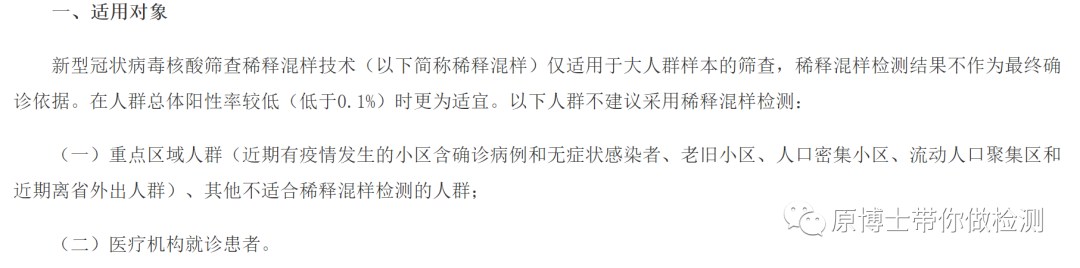 在目前的新冠检测筛查中普遍使用了混样检测,但是也有明确的限制条件“新型冠状病毒核酸筛查稀释混样技术(以下简称稀释混样)仅适用于大人群样本的筛查,稀释混样检测结果不作为最终确诊依据。在人群总体阳性率较低(低于0.1%)时更为适宜。