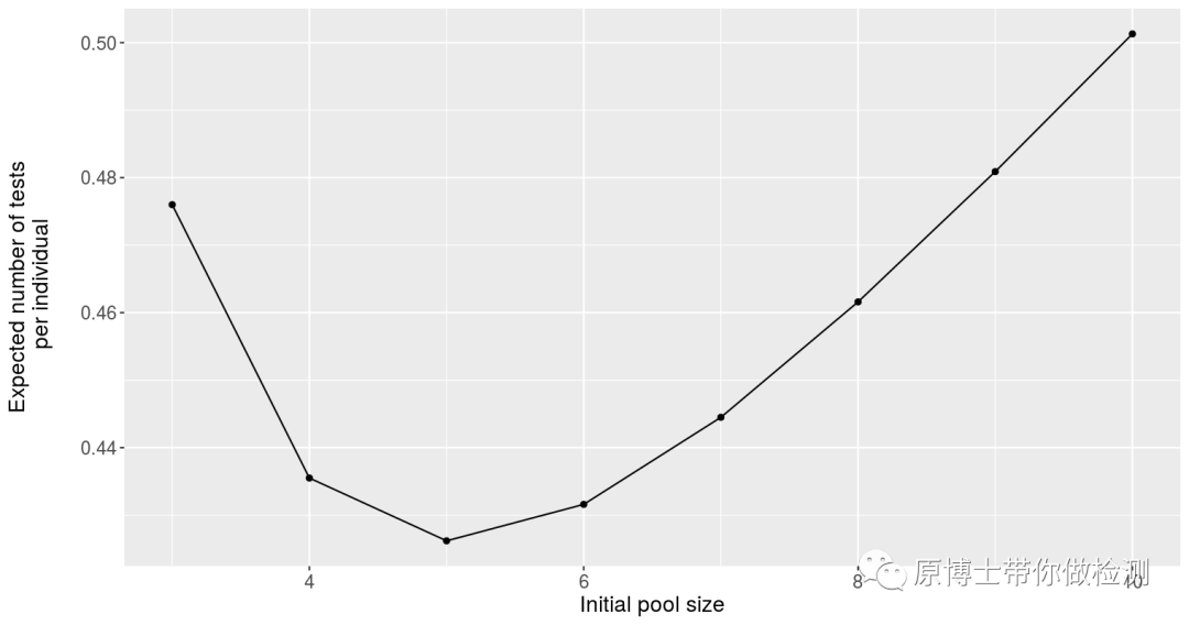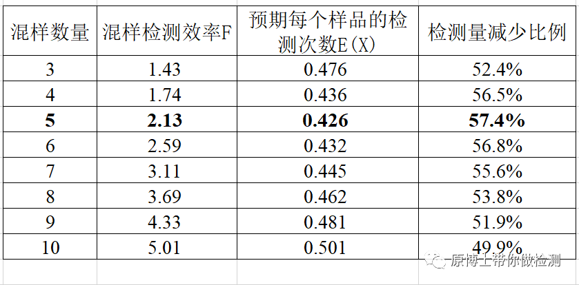 5%阳性率的情况下几混1检测最经济呢?我们可以从3混1到10混1逐一计算,计算结果如下,我们发现5混1时,E(X)最小,检测量减少比例最大,混样检测最经济。