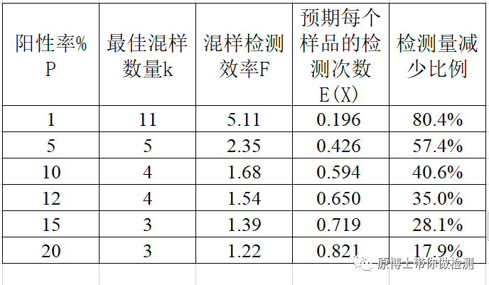 如下表所示阳性率越低,最佳混样数量越多,检测量减少的比例越大。当阳性率大于15%,检测量减少的比例已经低于30%,这时的混样检测的意义已经不太大了。每个实验室可以根据自己的情况设置混样的阈值限,例如:可以设置为阳性率12%,4混1,也可以设置为检测量减少比例小于40%的4混1等。