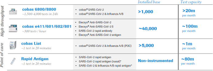 截止到2020年底,罗氏在150多个国家拥有雇员已经达到10万人,营收达到583亿法郎,其中诊断业务达到138亿法郎,得益于新冠产品的布局,从去年的财报到今年罗氏的各种报告和新闻,提及最多的就是“in the fight against covid-19”, “SARS-COV-2 test” “Pandemic”对待这场疫情,我们看到了巨头的社会责任感与担当,罗氏的社会责任感与担当也收获了前所未有的业绩回报,今年一季度诊断业务达到了43.3亿法郎,大涨55%,与新冠业务相关POCT产品营收达到了7.16亿法郎,这样的一个巨无霸在新冠疫情中将危机转化为机遇,IVD一哥罗氏正在用其125年风雨智慧与经验为大家上一堂难得的转为危机全方位布局的课程。 在此笔者应用了Roche财报年终总结的一段话,“罗氏在他125年当中遇到过也化解过各种各样的挑战,在这场与COVID-19新冠抗疫的过程中我们将更加增强我们的合作能力,我们将涅槃重生,成就更强大的自我。” 新冠方案从“诊”到“疗”全方位布局 罗氏是一家典型的药械相结合的巨头,上游检测诊断,下游药物治疗,诊断与Pfizer,阿斯利康等相比他的诊断器械更强,与Danaher,西门子等器械相比,他的药品又更强。罗氏集团全方位的诊断,利用大数据云计算进行诊与疗的搭建,前段提供诊断,后端提供罗氏药物治疗,形成 “诊”到“治”的无缝对接在新冠检测方面也如此: 诊断检测端:拥有分子PCR检测,抗原抗体antibody,antigen Naturalizing antibodies检测. 治疗端:high risk 到mild再到Hospitalized. 诊断业务从中心实验室临床检验到POCT两大产业线并驾齐驱 要想了解ROCHE的诊断新冠布局,我们先来了解Roche诊断家族产品:COBAS系列实验室(覆盖了免疫,大生化+化学发光+分子+血气电解质+凝血+病理+五分类+尿检等),+PCOT Accu系列(血糖+血脂+血凝+心肌+分子传染病检测+与SD组合快诊新冠检测等)形成两翼傲视群雄,高冷巅峰,有了这些基础武器,就可以随意搭配,打满组合拳。 市场中主要新冠检测为以下几种从高大上的分子核酸检测到最底层的胶体金检测,检测场景从中心实验室专业检测到胶体金家用自测检测: 1.新冠分子检测molecular(RNA提取,COVID-19 PCR检测), 2.化学发光CLIA(化学发光COVID-19抗体抗原,以及中和抗体检测) 3.酶联免疫ELISA(COVID-19抗原抗体,中和抗体检测) 4.免疫荧光(COVID-19抗原抗体,中和抗体) 5.分子POCT(COVID-19提取+扩增) 6.胶体金lateral flow COVID-19抗原抗体检测,以及中和抗体检测 结合Roche诊断产品布局,基本上涵盖了大部分主流检测 中心实验室高通量确诊布局 罗氏新冠分子检测布局:Cobas6800/8800目前是市面上样品处理,提取以及扩增读取集成度最高分子检测产品的巅峰产品之一,不仅自动化与通量高,目前的可提供的试剂2000万每月。主要布局国家中心实验室,第三方实验室,中大型医院。 主要为: •cobas®SARS-CoV-2 •cobas®SARS-CoV-2 & Influenza A/B 罗氏新冠化学发光检测布局:Cobas e411/601/602/801,新冠化学发光从高通到低通量全方位布局中心实验室,第三方实验室,中小型实验室。 •Elecsys®Anti-SARS-CoV-2 •Elecsys®Anti-SARS-CoV-2 S •SARS-CoV-2 rapid antibody •Elecsys®Anti-SARS-CoV-2 antigen POCT快速筛查,家用布局 POCT分子 检测布局:cobas liat在中小型医院以及实验室,采用非传统的微流控芯片结构。整个芯片类似于试管形状,检测管包含所有检测试剂并已分装入每一个独立区段,将所有核酸检测程序融为一体。其中包含试剂准备、样本富集、抑制物清除、核酸提取及实时荧光定量检测。 •cobas®SARS-CoV-2 & Influenza A/B (POC)