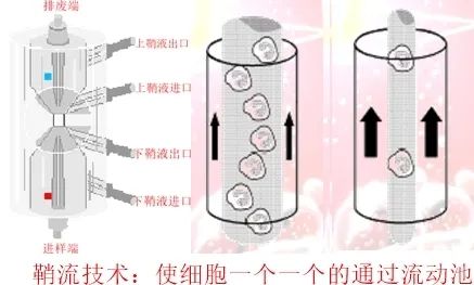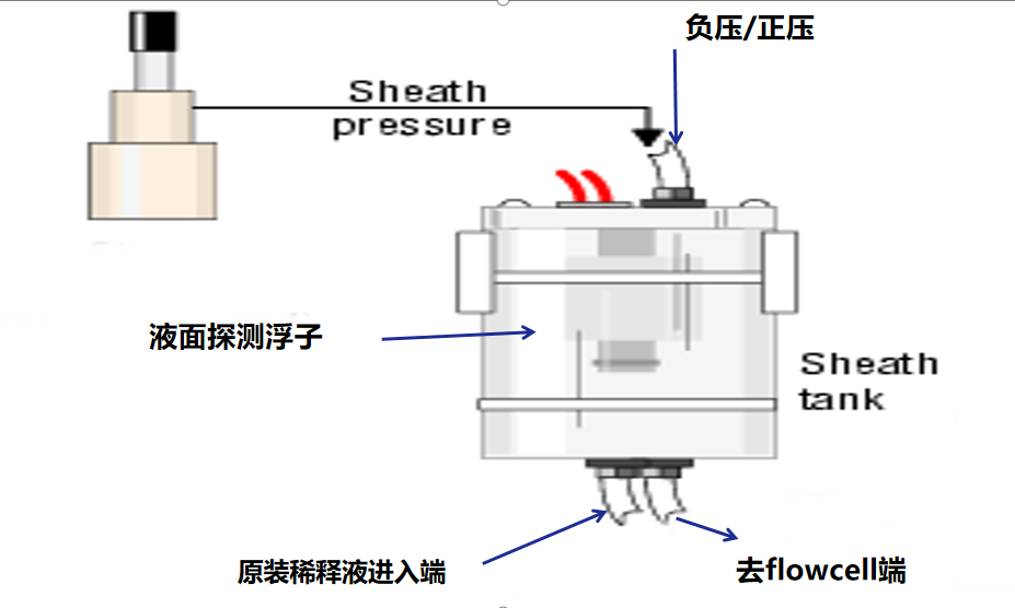 混匀池样本制备完成进入流动池进行测试前,要与鞘液结合。而鞘液储存在鞘液罐中,鞘液罐最核心部件就是液面探测的浮子,浮子会随着液面的高低,上下浮动,如果鞘液液面过低,上面浮子开关就会打开,从上面端口的加压系统,加入负压,罐子里的负压会使鞘液进入,鞘液的液面开始上升,等上升到一定高度后,浮子开关关闭,罐内负压消失,液面停止;如果有样本测试时,上端口加入正压使鞘液进入到流动池,包裹着细胞形成单细胞束。
