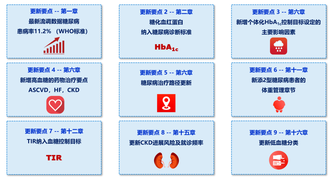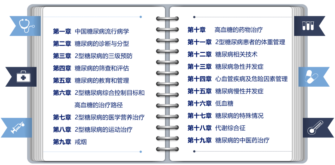 新版指南共19章,涵盖中国糖尿病流行病学、糖尿病的诊断与分型、糖尿病的筛查和评估、糖尿病的教育和管理、T2DM综合控制目标和高血糖的治疗路径等内容。