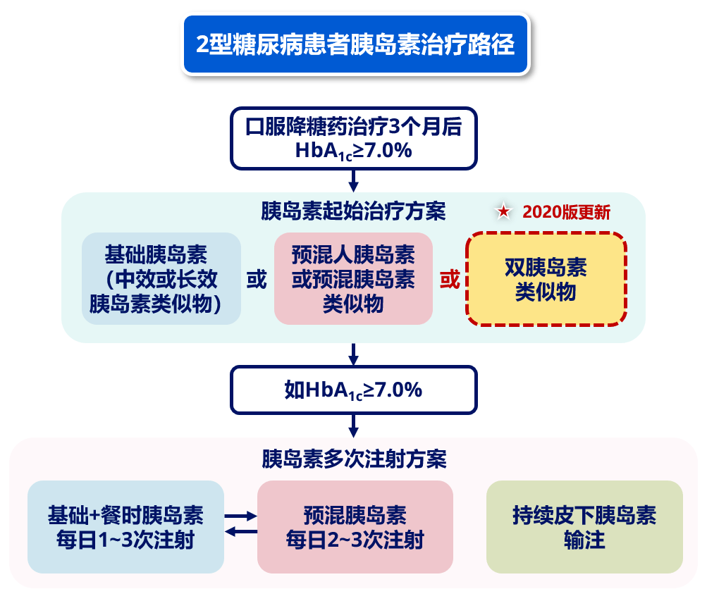 在胰岛素治疗路径中,T2DM患者在生活方式和口服降糖药联合治疗的基础上,若血糖仍未达到控制目标,尽早(3个月)开始胰岛素治疗(A)。新指南首次将双胰岛素类似物加入其中,目前上市的双胰岛素类似物只有德谷门冬双胰岛素(IDegAsp)。口服药治疗3个月后HbA 1c ≥7%即可起始双胰岛素类似物,每天1次治疗,于主餐前注射,剂量达到0.5 U/kg/d 或30~40 U餐后血糖仍控制不佳,或患者每天有两次主餐时,可考虑改为每天注射2次。