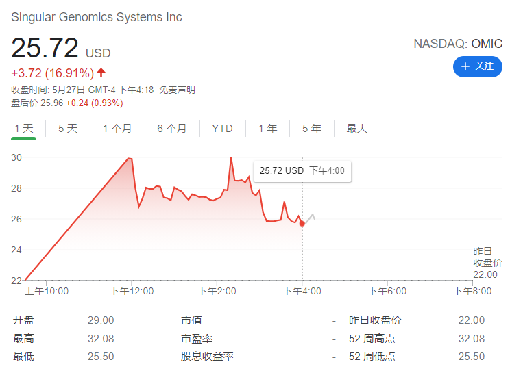 美东时间 5 月 27 日,致力于开发基因测序平台的初创公司 Singular Genomics Systems, Inc.(下称 “Singular”)登陆纳斯达克完成 IPO,股票代码为 “OMIC”。
