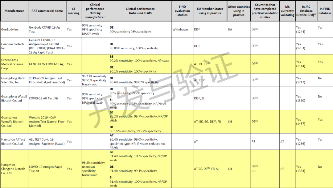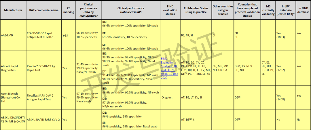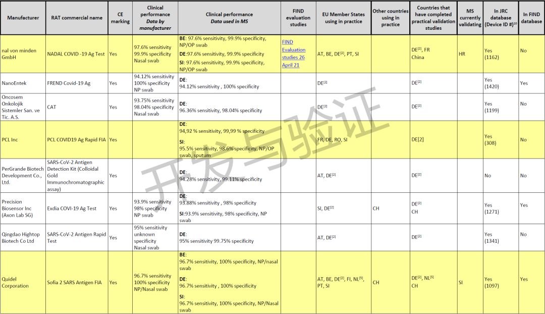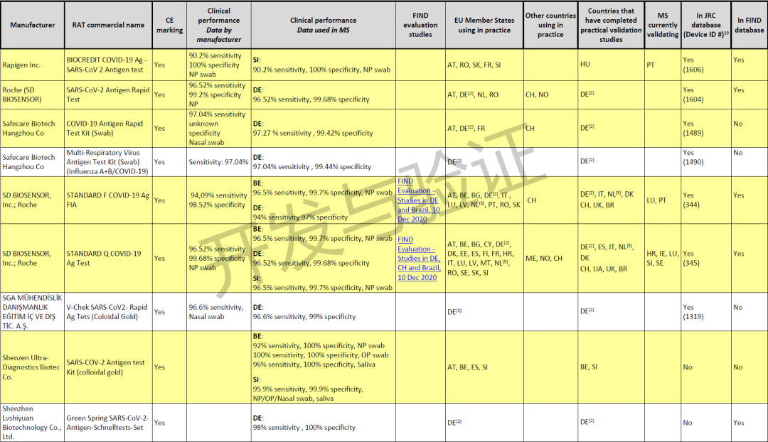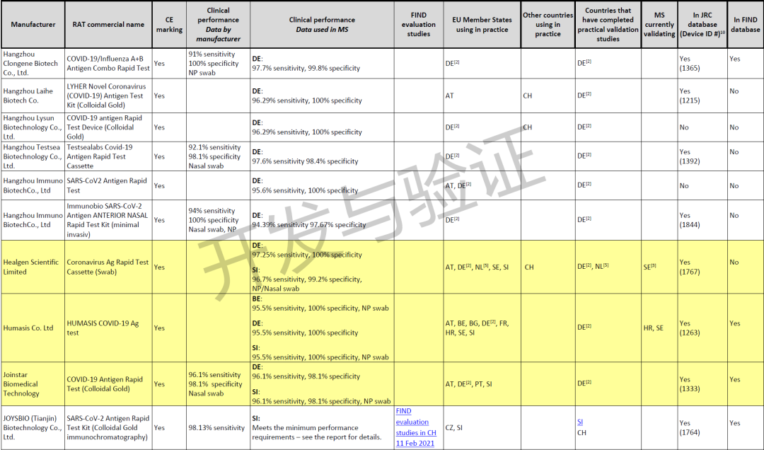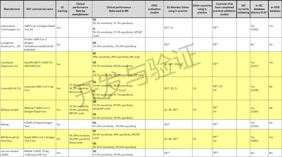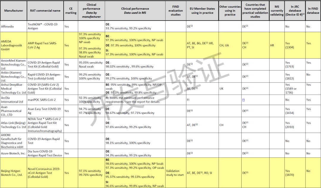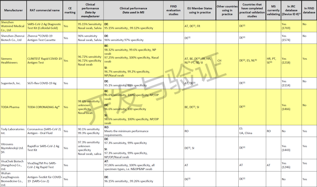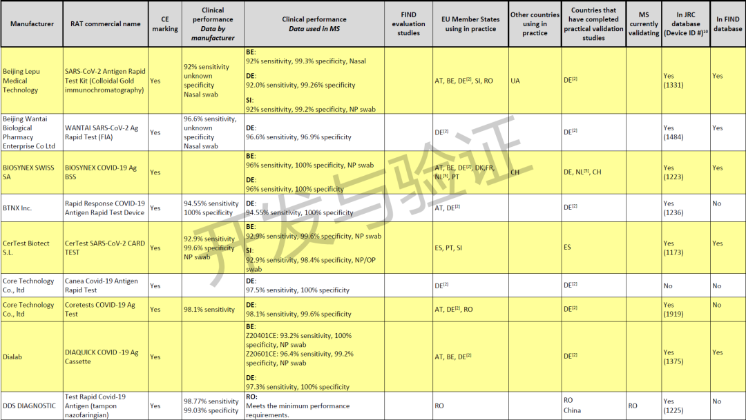 a. 带有CE标志。 b. 满足敏感性≥90%和特异性≥97%的最低性能要求;以及 c. 至少经过一个成员国的验证,认为其适合在COVID-19的背景下使用,并提供有关此类研究方法和结果的细节,如验证所用的样本类型、评估测试使用的环境,以及在所要求的灵敏度标准或其他性能要素方面是否出现任何困难。