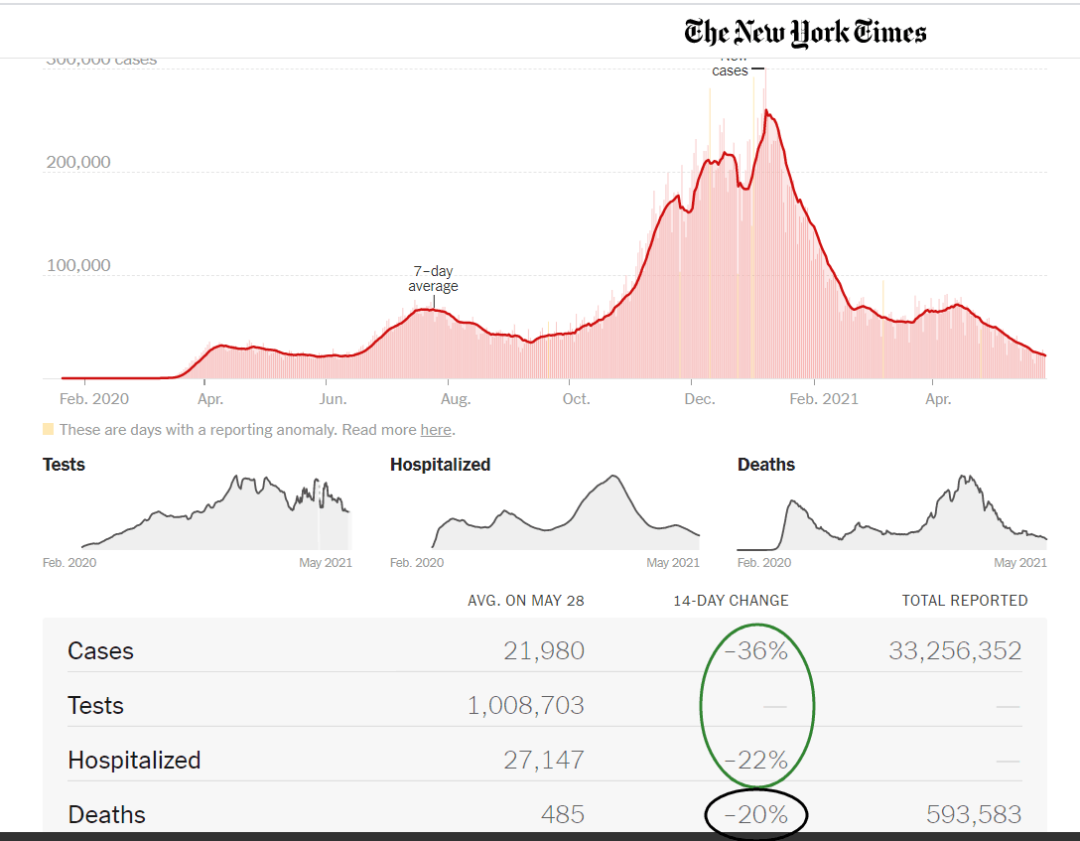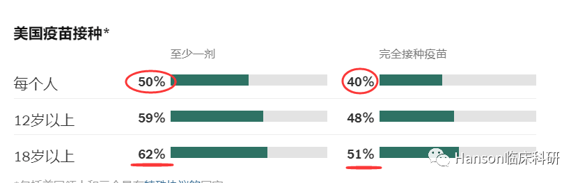 根据纽约时报疫情跟踪器,2021年5月28日,美国新增COVID-19为21,727例,接近近一年来最低水平;相比较1月8日300,628例的高峰,降低了93%。 (图源:纽约时报疫情跟踪器) 让我们担心的“脱口罩后疫情复燃”也没有发生。 美国白宫于5月13日宣布:所有完全接种疫苗的人,都可以回复正常活动,而无需戴口罩或者保持社交距离。但实际上,马上有很多州立即就宣布:所有人都可以不戴口罩。 脱口罩已两周,在这两周里,美国新增病例、住院病例和病死人数均保持降低,依次为新增病例降低36%、住院病例降低22%,而病死人数降低20%。 除了美国国内已经开放,美国对外领事馆签证也重新开放,从4月9日开始,美国驻中国领事馆恢复了移民签证;5月4日开始签发学生签证。 这一切都意味着,美国社会正迅速从疫情中走出来。很多人更是直呼“美国赢了”。 确实如此,或者至少,美国正在通往全面控制新冠疫情的路上。 疫情控制主要归功于美国生物医学的创新,快速研发出了高效的新冠疫苗。尤其是辉瑞/德国BioNTech和Moderna公司的mRNA疫苗,针对有症状COVID-19的保护力高达94%-95%。 另外,则是由于民众踊跃接种。截止到5月28日,美国所有人群中,有50%至少接种了一剂疫苗;而成年人中,有62%的人群已经接种了至少一剂疫苗。 (图源:纽约时报疫情跟踪器) 根据目前的接种速度,在 |