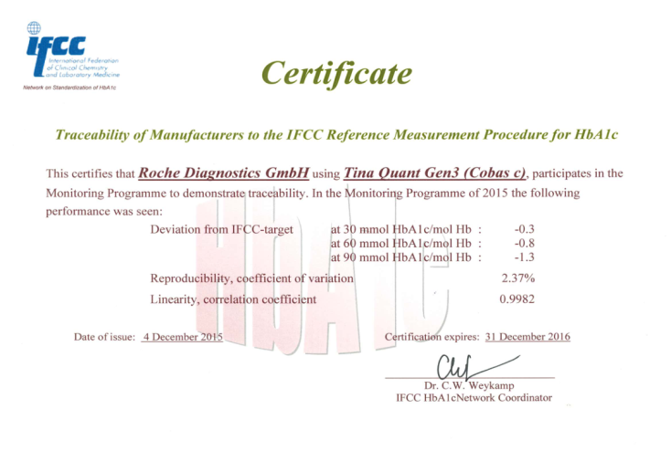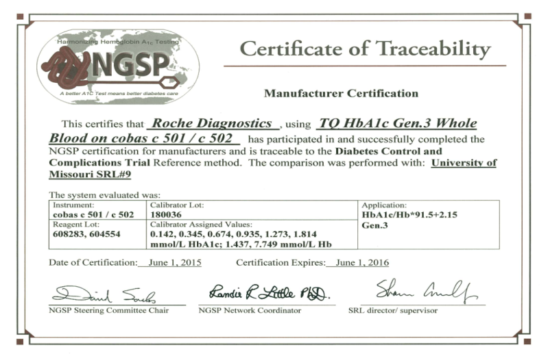 三、什么是溯源性? 溯源性(可追溯性)Traceability:通过一条具有规定不确定度的不间断的比较链,使测量结果或测量标准的值能够与规定的参考标准,通常是与国家标准或国际标准联系起来的特性。[VIM:1993,定义6.10] 临床实验室一直有一个做法,即:通过患者样品的比对(方法学比较),认可实验室检测结果的可靠性。在公认实验室与新实验室的各个相同项目的检测结果间具有良好可比性时,新实验室结果的可靠性可以公认实验室为证。可惜,这样的比较并不说明新实验室的检测结果可“溯源”至公认实验室。 ISO 17511标准不适用于:c) 在相同的计量水平下,测量相同量的两个测量程序的测量结果具相关性,但是这样的“水平”相关不提供计量可追溯性。 何为溯源?溯源之溯,乃逆流而上。《水经注·江水》:“沿溯阻绝。”引申为追求根源。如:追本溯源;不溯既往。[引自“辞海”]。因此,临床实验室的常规实验室间的比对,属于相等等级的比对,没有溯源性。若常规实验室的检测系统与参考实验室的参考系统,对同批患者标本的比对,实现了可比性时,实验室有强烈的证据说明:他们常规系统对患者标本的检测结果的可靠性可以向上溯源到参考系统。实现了溯源性。 证明公司检测系统中的校准品真的具有溯源性。需要出示溯源性证书。实验室需要注意该证书的有效期。 如:罗氏cobas c系列Tina Quant Gen3 IFCC溯源性证书。 如:罗氏cobas c 501/502 NGSP溯源性证书 注意,所有产品的溯源性证书,均注明是什么公司的什么仪器和试剂的;使用了什么校准品。并且一定注明有效期。 上述对溯源性的定义和解释,说明由上一级的参考系列,与常规实验室使用的检测系统,对一组新鲜患者样品,通过检测相同的分析物;经方法学比较的数据统计,说明,常规检测系统对患者样品的检测结果,与参考体系对相同组患者样品的检测结果,若在量值上具有强烈的可比性!由此实现了参考系列与常规检测系统的一条比较链。 无论常规检测系统的检测原理如何(绝大多数均与参考系统完全不同),只要它对指定的一组患者样品的检测结果,能够与参考系统对相同组患者样品的检测结果在量值上具有了良好的可比性。此时,常规检测系统对患者样品检测结果量值的可靠性,可以上溯至参考系统,由此建立了对参考系统的溯源性! 溯源了什么? 1、具有溯源性的是患者样品检测结果! 2、认可具有溯源性的,是看方法学比较结果的量值数量关系! 3、方法学比较时使用的患者样品,都是经过严格挑选的。按照美国CLSI的EP9文件,将会对比对方法的任何一个或二者,产生干扰作用的样品全部剔除!也即,比对是在最佳条件下实施的。 因此,千万不要认为,有了溯源性,该公司的产品,从量值定义、到检测原理、以及检测的可靠性,完全与参考方法、或以参考物质校准的参考系统一样!大错特错! 以下,我将以具体示例说明。
