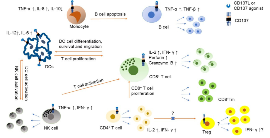 IL-2或IL-15可诱导NK细胞表达CD137,刺激NK细胞产生IFN-γ, 进一步支持T细胞活化。CD137信号可促进CD8+T细胞增殖、存活、增强细胞毒性和代谢适应性,并可产生CD8+记忆T(Tm)细胞。CD137激活后,CD4+和CD8+T细胞都产生IL-2和IFN-γ。CD137在T调节细胞(Treg)中的功能存在争议,CD137激活可导至Treg增殖,但可改变Treg产生细胞毒性或辅助效应。