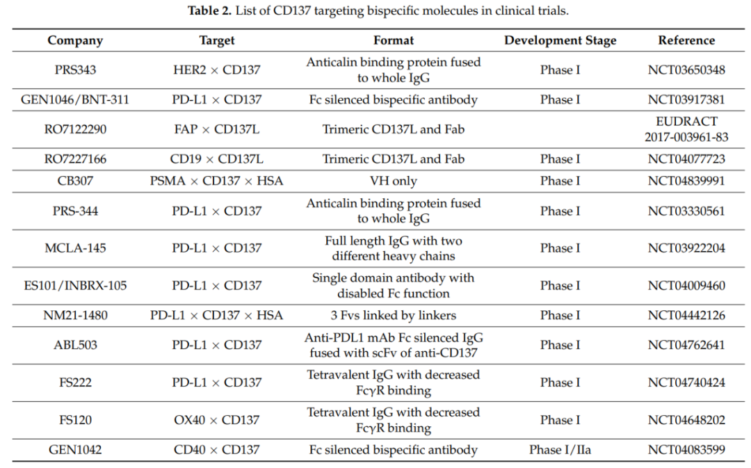 上表总结了CD137靶向双特异性分子的临床研究进展。