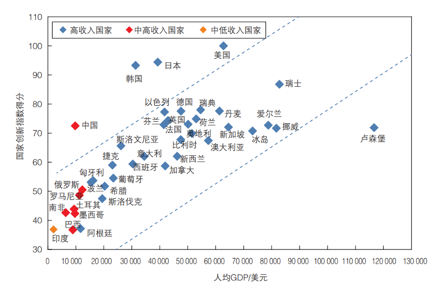 “值得关注的是,中国创新能力稳步上升,大幅超越处于同一经济发展水平的国家。”刘冬梅指出,2018年中国人均GDP为9771美元,在世界40个主要国家中仅高于印度、南非、巴西、土耳其和墨西哥。但是,中国创新指数得分已接近人均GDP在5万美元左右的欧洲国家,是唯一一个R&D投入强度超过2%的中高收入阶段国家。