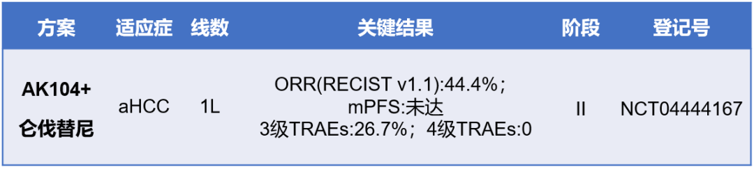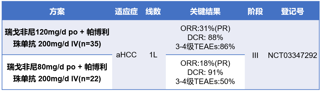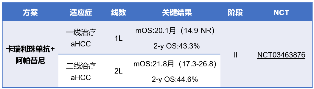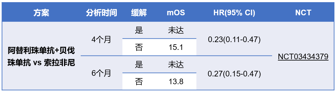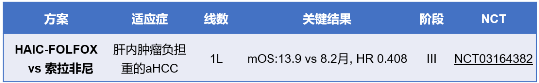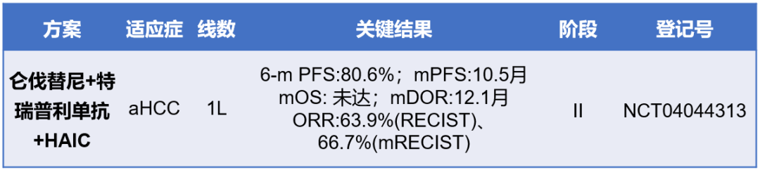 1、FOHAIC-1 研究:晚期肝癌中对比肝动脉灌注化疗(HAIC)和索拉非尼治疗的疗效(#4007) 晚期肝细胞癌初诊时多有肝内转移,但是IMbrave150、SHARP、Asia-PacificSHARP等研究纳入的患者肝内转移占比较少。中山大学肿瘤医院赵明教授牵头开展的FOHAIC-1研究旨在评估肝内肿瘤负荷较重的aHCC患者使用HAIC-FOLFOX方案作为一线治疗的效果,同时寻找获益相关的生物标志物。这是一项开放标签的 3 期研究,入组的是未经系统治疗的晚期肝癌患者,按照 1:1 的比例随机接受 FOLFOX 方案的肝动脉灌注化疗(HAIC)或者索拉非尼口服。入组患者的基线肝内肿瘤负荷较大,其中 80% 以上合并门静脉癌栓,中位肿瘤直径10 cm以上,肝内肿瘤负荷超过 50% 的患者达到了 40% 以上。2017 年 5 月至 2020 年 5 月期间,共入组 260 例患者。主要终点方面,HAIC 组的 OS 显著优于索拉非尼组(中位 OS 分别为 13.9 月和 8.2 月,HR=0.408,P<0.001)。HAIC 组有16例(12.3%)的患者实现了肿瘤降期,其中 15 例接受了根治性手术或射频治疗,这部分患者的中位 OS 为 20.8 月,1年生存率为 93.8%。IMbrave 150 研究的结果毋需赘述,与索拉非尼相比,阿替利珠单抗+贝伐珠单抗(A+T组合)在OS、PFS、生活质量维持等方面均显著优于索拉非尼单药治疗。比较4个月时和6个月时达到缓解(RECIST1.1,CR+PR)与未达缓解患者的OS差异,初步分析显示,确定的治疗缓解是OS的独立预测因子。另一项探索性分析旨在比较两种治疗在 Vp4 型门静脉癌栓(门脉主干癌栓或主瘤所在的对侧肝叶门静脉分支癌栓)患者中的疗效差异。IMbrave150研究共入组501人,其中Vp4患者73人,A+T组和索拉非尼组分别有 48 例和 25 例患者纳入分析。中位随访15.6个月(ITT人群),结果如下:OS方面,A+T组显示了更好的疗效但未达到统计学差异(HR=0.62,95%CI 0.34-1.11),两组的中位OS分别为7.6月和5.5月,此外,联合治疗组的 PFS(RECIST1.1标准)也在数值上更优,中位PFS分别为5.4和2.8月(HR=0.62,95%CI 0.35-1.09) ,ORR则分别为23%和13%。整体而言,Vp4型癌栓的患者预后太差了,目前生存期还停留在半年左右。这部分患者不仅肿瘤进展十分迅猛,门脉血流不通也导至肝功能和消化功能受影响。3、RESCUE 研究:卡瑞利珠单抗+阿帕替尼(双艾组合)用于晚期肝癌的 OS 数据更新(#4076)RESCUE研究包含两个队列,分别探讨双艾组合用于晚期肝癌一线和二线治疗的效果,去年10月在ESMO上公布了主要终点ORR(IRC)的结果并全文发表在CCR杂志上:一线治疗ORR34.3%,二线治疗ORR22.5%(RECIST v1.1标准)。当时,二线治疗的患者因为入组较晚,还没能估算中位 OS。目前,中位随访时间达到了 29.1 月,本次ASCO报道了次要终点OS的结果:这一结果颇令人振奋。双艾组合的治疗费用比较亲民,国内患者接受这一方案治疗后,中位OS达到20个月左右。其他的联合治疗方案也报道了相似的OS数据,包括T+A 方案、仑伐替尼+帕博利珠单抗(可乐组合)、O+Y组合等。但需要注意的是,不同研究入组的人群不同,中位OS数据不宜在不同研究之间作比较,例如,RESCUE研究中,二线治疗的中位OS数据在数值上看起来比一线治疗还长一点,这或许是二线治疗入组的患者相对没那么晚期所致。4、瑞戈非尼+帕博利珠单抗用于晚期肝癌一线治疗的 1b 期临床试验结果(#4078)二线治疗晚期肝癌的RESORCE研究(NCT01774344)中,瑞戈非尼剂量160mg/d,但在实际的临床应用中,很少有患者能耐受瑞戈非尼160 mg/d的标准剂量,在与PD-1单抗联用时,需要进一步降低剂量。这项1b期的研究评价了瑞戈非尼的两个剂量与帕博利珠单抗的标准剂量联用时的安全性和有效性:可以看出来,随着瑞戈非尼的减量,安全性在提高,疗效在降低。5、仑伐替尼+ AK104 用于不可切除肝癌的一线治疗(#4101)康方生物的AK104是一种人源化IgG1双特异性抗体,能同时结合PD-1和CTLA-4。该项多中心、单臂、II期研究纳入30名无法切除的aHCC患者(93.3%HBV阳性),接受AK104(6mg/kg,q2w)+仑伐替尼(标准剂量)作为一线治疗。在目前可评估的18例患者中,疗效数据看起来很不错,RECIST v1.1 评价的 ORR 达到了44.4%,DCR 为77.8%。中位PFS未达到。安全性方面,3级及以上治疗相关不良事件的发生率为26.7%。目前,CTLA-4抗体的使用都是短时间使用之后停药,以减少不良事件的发生率,期待这类药物在国内早日上市。与之相对的是,个人对于双特异性抗体倒不是很期待,与其用固定组合的双特异性抗体,或许还不如自由地组合使用两种抗体。6、仑伐替尼+特瑞普利单抗+肝动脉灌注化疗(LTHAIC)用于晚期肝癌的 II 期研究(#4083)这是一项由中山大学附属肿瘤医院牵头的II期单臂研究,纳入36名未经治疗的aHCC患者,使用仑伐替尼(体重<60kg,8mg;体重≥60kg,12mg)+特瑞普利单抗(240mgIV)+HAIC(FOLFOX方案)。这部分患者相对很晚期,中位肿瘤直径11.2 cm,86.1% 的患者有门脉癌栓,27.8%的患者有肝外转移。随访11.2个月后,主要研究终点方面,6个月PFS率为 80.6%,中位PFS为 10.5 月。以RECIST v1.1 和 mRECIST标准来看,ORR分别高达63.9%和 66.7%,且其中13.9%的患者出现了CR。另外,8例患者获得了肿瘤降期,达到了可切除状态。3-4 级治疗紧急不良事件(TEAE)发生率相对较高,达到了 72.2%。