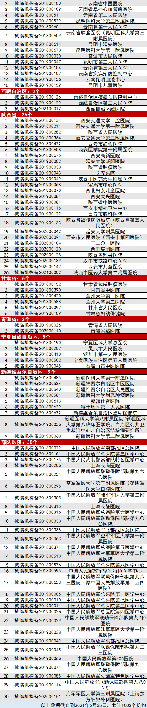 国家药监局发布「医疗器械临床试验备案机构目录」,截止到2021年5月25日,共计1002个机构,其中广东省最多有104个,占全国10.3%。
