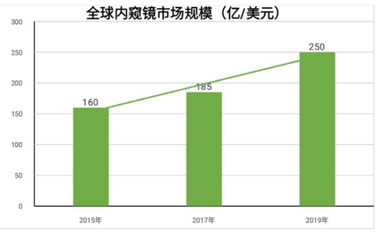 据数据统计,全球内窥镜市场规模2015年高达160亿美元,2017年为185亿美元,2019年为250亿美元;预测复合年增长率在6.6%左右,2022年全球内窥镜市场有望突破300亿美元。 国内内窥镜市场虽然开展较晚,但基于我国人口基数以及饮食习惯的差异性,内窥镜市场规模增长较快。据数据统计,国内内窥镜市场从2012年的83亿元人民币增长到2019年240亿元人民币。