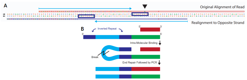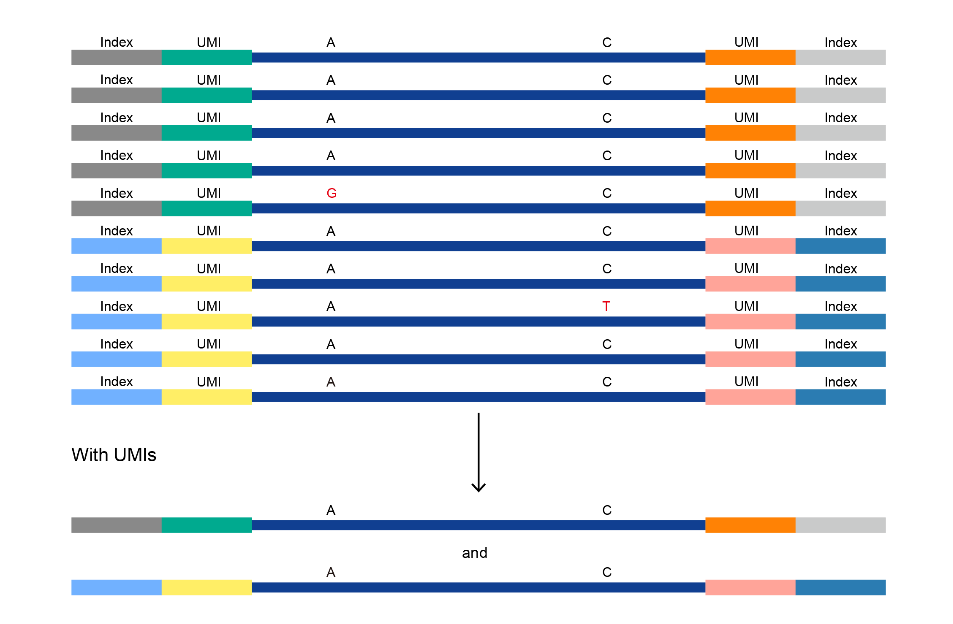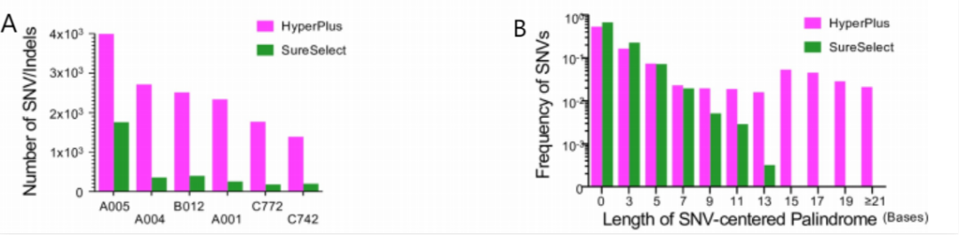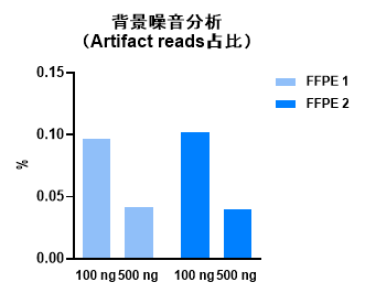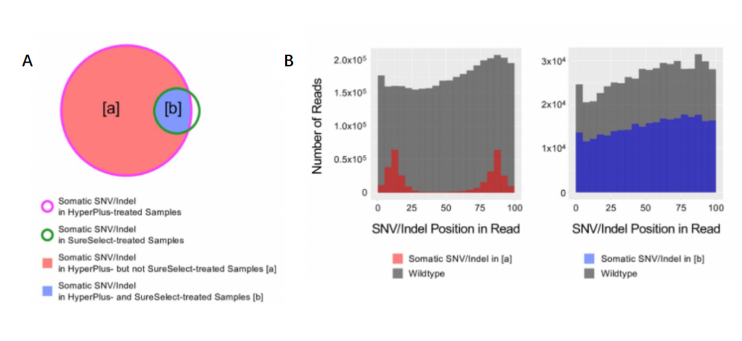癌症是威胁人类健康的严重疾病之一。近年来,我国癌症发病仍处于逐年上升的态势,为肿瘤检测提出了更高的要求。高通量测序为肿瘤检测提供了一种全新的方法,相较于传统的影像学检查、肿瘤标记物检测和组织活检,肿瘤NGS检测具备高灵敏性,多基因平行检测等优点,还可以检测罕见突变位点,为癌症、遗传病等复杂疾病诊疗带来新的契机。但肿瘤NGS检测的高深度测序也带来了大量的假阳性,给NGS结果的判读带来了一定的难度。 通常高通量测序过程包括样本的储存和处理、核酸提取、片段化、文库扩增、测序和生物信息学分析。在文库构建过程中,片段化过程中发生的错误,会进一步导至扩增偏差,进而影响文库扩增后的准确性,并产生背景噪音。因此,减少片段化过程中产生的偏差尤为重要。 酶法 根据Chigusa S等人的研究[1],相对于机械打断法,酶法构建的文库中的Artifact SNV/Indel的数量要大得多。如图2A所示,使用片段化酶法构建文库的SNV/Indel检测数是使用机械法构建的文库的2.3~9.9倍。此外,许多体细胞SNV恰好位于回文序列的中心,称为SNV-centered palindromes(SCPs),使用片段化酶法构建的文库中含有更多且长度更长的SCP,如图2B所示。 对使用片段化酶法和机械法构建文库中的SNV/Indel进行分类,可以发现使用不同建库方法构建文库的SNV/Indel检出有相交的部分(图3A)。我们可以将这个部分理解为真实存在的SNV/Indel。此外,片段化酶法构建的文库中出现了大量在机械法构建文库中没有出现的部分,这个部分就是假阳性突变。 如图3B所示,使用片段化酶法构建的文库中,SNV/Indel通常位于3‘或5’末端10-15个碱基的位置。而使用机械法构建的文库中,SNV/Indel分布比较均匀。 在片段化酶法构建的文库中,这些假阳性突变是如何产生的呢? 在分析片段化酶法打断的文库时,经常会发现一些人工合成的序列(Artifact reads)。通常这些Artifact reads碱基质量高,表示它们是真实分子的衍生物,而不是测序过程中产生的错误,并且这些Artifact reads通常能在附近的参考序列中找到反向互补序列(如图4A所示)。这种高碱基质量的Artifact reads可能会导至SNV/Indel的误报,出现假阳性突变。 根据Gregory T等人的研究[2],在酶的作用下,DNA分子暴露了某些反向互补序列,这样的反向互补序列异常结合在一起,就会导至DNA序列发生结构上的改变(颈环结构)(如图4B所示),形成假阳性突变。 文库扩增和测序过程 那么在文库扩增以及测序过程中,是否会造成假阳性突变呢?答案是肯定的。 为解决片段化和文库扩增、测序过程中产生假阳性突变问题,可以在接头连接过程中,使用含有UMI标签的接头。 UMI (Unique Molecular Identifiers)通常设计为完全随机的核苷酸链(如NNNNNN)、部分简并核苷酸链(如NNNRNYN)或者固定核苷酸链(当模板分子有限的情况下)。从图5可以看出,片段化和末端修复后的同一个DNA分子在测序后会产生多条reads,其中有个别碱基出现了突变(标红的碱基),这就是文库扩增和测序过长中产生的假阳性突变。引入UMI标签,剔除扩增和测序过程中产生的假阳性突变,可以提高低频突变检出率。 ![]() 为解决片段化酶法建库产生假阳性突变的问题,诺唯赞研发团队针对性的进行了体系优化和升级,从源头上降低片段化酶法建库中的假阳性突变。诺唯赞即将推出升级版片段化酶法建库试剂盒VAHTS®Universal Plus DNA Library Prep Kit for Illumina V2(Vazyme #ND627),搭配双端UDI UMI接头VAHTS®Dual UMI UDI Adapters Set 1- Set 4 for Illumina(Vazyme #N351-N354),可降低假阳性突变,使检测结果准确性更高,更加可信。 以下为Vazyme #ND627首批客户测试反馈: 使用两个不同的FFPE样本进行测试,样本输入量为100 ng、500 ng,捕获后上机测序。下机数据量约8000 M,目标区域去重后的平均深度仍能达到4000 ×以上,可以达到生信分析的要求。 图6. 下机数据平均深度。 对所测样本的Artifact reads占比进行分析,使用Vazyme #ND627进行文库构建后,Artifact reads占比可低至0.1%,极大降低了SNV/Indel检出假阳性。
