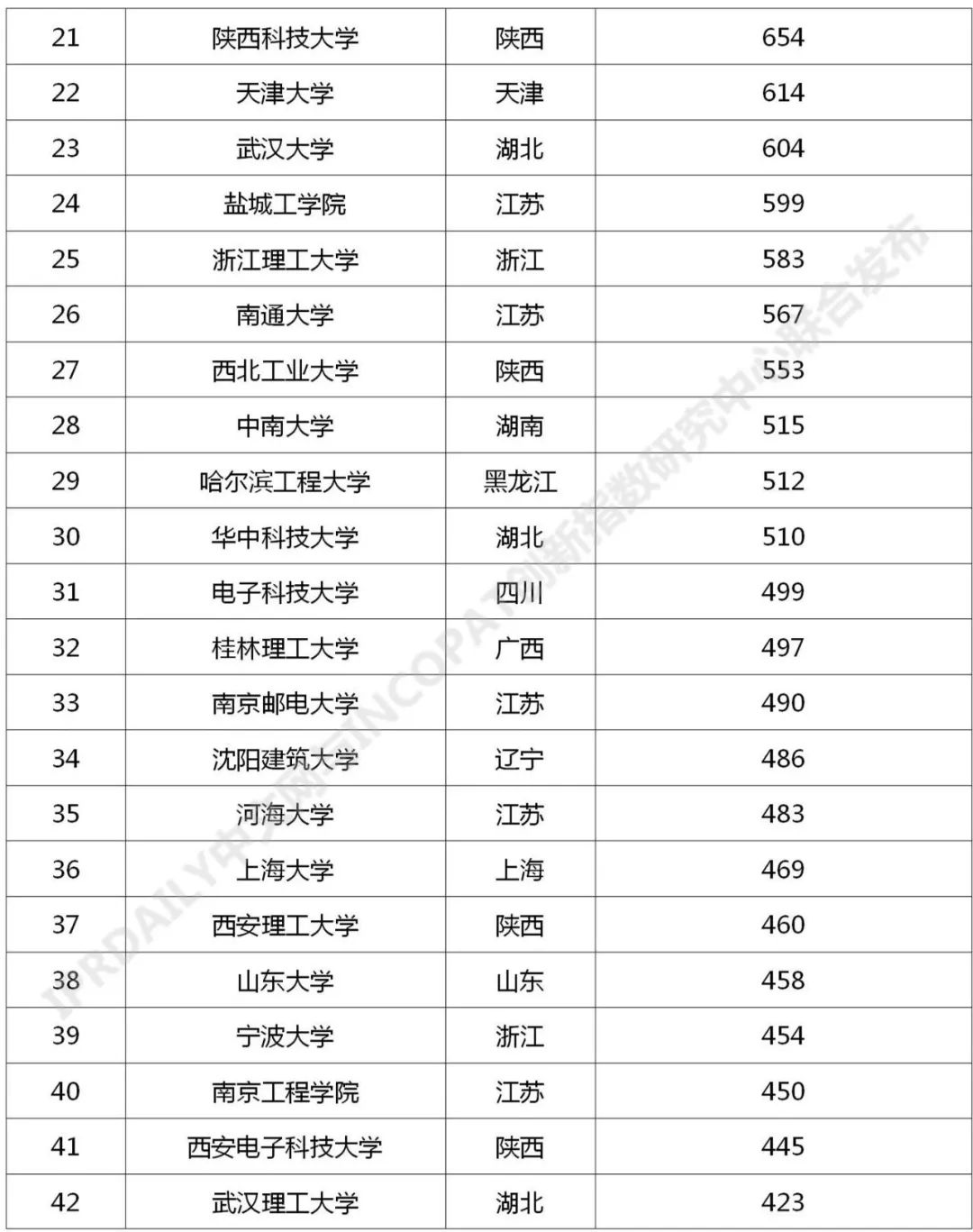 来源:IPRdaily中文网、incoPat创新指数研究中心 导读:近日,知识产权产业媒体IPRdaily与incoPat创新指数研究中心联合发布“中国高校专利转让排行榜(TOP100)”,前100名中国高校主要分布在江苏、北京、浙江、陕西、湖北、上海、广东等24个省市,国内专利转让数量均在191件及以上。其中南京林业大学以2531件专利位列第一,清华大学以2231件专利排名第二,上海交通大学以1548件专利排名第三。 当前,我国正在加快构建以国内大循环为主体,国内国际双循环相互促进的新发展格局,技术作为关键的生产要素,专利作为技术的主要载体,畅通技术要素流转渠道,提高专利资源配置效率,对于促进形成“双循环”新发展格局具有重要意义。2021年3月,财政部办公厅、国家知识产权局办公室发布《关于实施专利转化专项计划 助力中小企业创新发展的通知》,决定实施专利转化专项计划,利用三年时间,实现专利转化运用的激励机制更加有效、供需对接更加顺畅、转化实施更加充分、工作体系更加完善,专利技术转移转化服务的便利性和可及性显著提高,高校院所创新资源惠及中小企业的渠道更加畅通,中小企业创新能力得到大幅度提升,有力支撑知识产权密集型产业创新发展。 在此,我们对截至2021年3月31日,中国高校在中华人民共和国国家知识产权局登记生效的专利申请权/专利权转让数量(不含港澳台)进行了统计分析,以供参考。 中国高校专利转让排行榜(TOP100) 对截至2021年3月31日,中国高校在中华人民共和国国家知识产权局登记生效的专利申请权/专利权转让数量(不含港澳台)进行统计排名,前100名中国高校主要分布在江苏、北京、浙江、陕西、湖北、上海、广东等24个省市,国内专利转让数量均在191件及以上。其中南京林业大学以2531件专利位列第一,清华大学以2231件专利排名第二,上海交通大学以1548件专利排名第三。 数据整理:IPRdaily 数据来源:incoPat 中国高校国内专利转让技术分布 统计截至2021年3月31日,中国高校在中华人民共和国国家知识产权局登记生效的专利申请权/专利权转让数量(不含港澳台),通过IPC国际分类号分析该部分专利发现其主要围绕G01(测量;测试)、A61(医学或兽医学;卫生学)、G06(计算;推算;计数)、H01(基本电气元件)、C07(有机化学〔2〕)、H04(电通信技术)、C12(生物化学;啤酒;烈性酒;果汁酒;醋;微生物学;酶学;突变或遗传工程)、C08(有机高分子化合物;其制备或化学加工;以其为基料的组合物)、B01(一般的物理或化学的方法或装置)、A01(农业;林业;畜牧业;狩猎;诱捕;捕鱼)等技术领域分布。 数据整理:IPRdaily 数据来源:incoPat 排行榜说明: 排行榜统计截至2021年3月31日,中国高校在中华人民共和国国家知识产权局登记生效的专利申请权/专利权转让数量,包括发明、实用新型及外观设计专利,不包括香港、澳门和台湾的专利数据;专利公开公告日截至2021年3月31日,专利转让执行日截至2021年3月31日,转让信息包括专利权的继承或转让,不包括专利权人的变更;转让人统计高校和与该高校相关的分校区、附属校区、研究院、研究所、直属附属医院为转让人的专利,未包含与该高校相关的上级机构、校办企业、校属企业、合作企业、非直属附属医院、教学医院为转让人的专利。排行榜出现部分高校的专利件数相同,未做并排合并,是依据检索结果依次排列。以上排行榜仅为趋势参考。 |