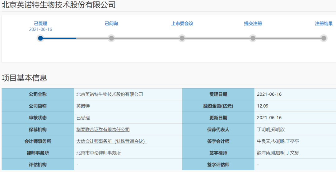 6月16日获悉,上海证券交易所成功受理了北京英诺特生物技术股份有限公司(以下简称“北京英诺特”)的上市申请,拟融资12亿元。