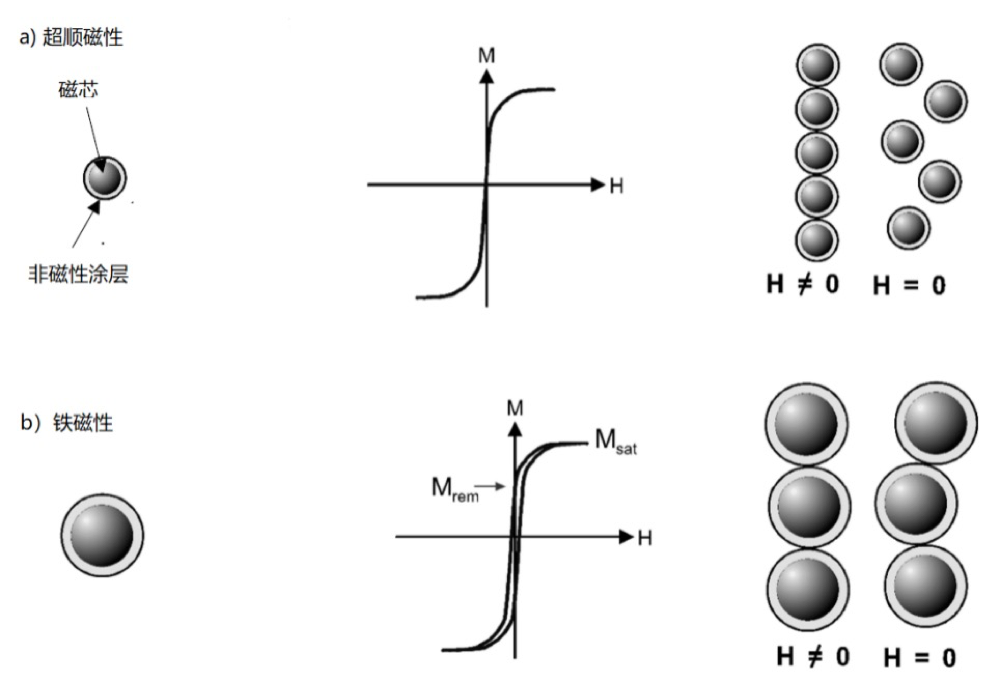 这是一个技术专栏,在这个专栏当中,由全球诊断技术大咖为大家带来诊断技术开发方面的技术谈谈,这是本系列的第二篇,我们非常有幸邀请到了德国弗劳恩霍夫光子微系统研究所的Christine Ruffert主任为带来磁珠技术的讲解。 1、超顺磁性纳米粒子在微流控中的应用 现在让我们更详细地了解一下被称为超顺磁性的物理现象。超顺磁性是一种发生在足够小的铁磁或铁磁纳米粒子中的磁性。通常情况下,铁磁或铁磁材料在其居里温度以上会过渡到顺磁状态。 这种形式的磁性描述的行为,当材料被外部磁场吸引,并在材料中诱导出一个内部场,这是沿着应用场的方向定向的。顺磁性材料的特点是相对磁导率大于或等于1,由外加磁场在材料中诱发的磁矩相当弱。 超顺磁性在转变温度方面与顺磁性不同,因为它发生在材料的居里温度以下。 此外,纳米粒子是磁各向异性的基础:磁特性取决于方向。这意味着,磁矩倾向于沿着材料的易轴排列,而在各向同性的材料中,在没有外场的情况下,没有发现其磁矩的偏好方向。 由于纳米粒子的磁各向异性,磁矩通常有两个方向,沿易轴方向彼此反平行排列。这两个方向被一个能量屏障分开。在有限的温度下,磁化有一定的概率翻转并扭转其方向。 磁化方向在这两种状态之间随机翻转,有一个典型的弛豫时间,称为Néel弛豫时间。这个特征时间指数地取决于Néel-Arrhenius方程给出的项 与材料的特定尝试周期0(通常在1-100ps的数量级)、磁各向异性系数K(J/m3)、样品体积V、玻尔兹曼常数 和绝对温度T。 铁磁或铁磁纳米粒子可以被类似于传统顺磁的外部磁场所磁化。在没有外部磁场的情况下,平均磁化为零。 超顺磁性能是样品操作的理想选择,因为通过外部磁场可以实现固定化和定向传输,而且通过简单地关闭磁场,可以很容易地将绑定在磁珠上的样品从固定化状态中释放出来,从而中断磁力作用。 超顺磁性的另一个优点是,在关闭或移除外部磁场后,超顺磁性珠子不会结块,因为没有永久磁化。 图1勾勒出一个多域结构、一个单域粒子和一个超顺磁性样品的磁性行为。根据Néel-Arrhenius方程,磁性行为指数地取决于磁性体积V(即颗粒大小)、磁性各向异性系数K(这是由材料决定的),以及样品的环境温度T。磁矩自发地翻转,以Néel弛豫N时间为特征周期。 图1. 具有(a)多域结构、(b)单域和(c)超顺磁特性的磁性样品的磁行为 根据它们的大小和磁性含量,通常由磁铁矿(Fe3O4)或磁铁矿(主要是在面心立方晶体改性γ-Fe2O3)组成,磁性纳米粒子具有超顺磁或铁磁行为。 图2比较了超顺磁性或铁磁性行为的特点。图2比较了球形磁性纳米粒子和微粒子的超顺磁和铁磁行为。图2a左图是一个具有磁性核心和非磁性涂层的球形纳米粒子,具有超顺磁特性。 中间相应的磁化环显示了超顺磁性纳米粒子集合的特征磁特性:既没有磁滞,也没有残余磁化,这是由曲线的零交叉点证明的。在图2a的右边,显示了一个在磁场H存在下的纳米粒子上层结构的示意图。 当磁场关闭时,上层结构会分解成单个颗粒。这归因于没有残余的磁化。在没有外部磁场的情况下,单颗粒之间不会发生相互作用。 图2b在左边表示一个球形磁性微粒子的示意图。中间相应的磁化环示意图说明了这种铁磁粒子集合的磁特性,其特点是有磁滞现象。残余磁化Mrem和饱和磁化Msat被指出。 在磁场H的存在下,一个微粒子的上层结构被创造出来,其外观呈链状,如图2b的右图所示。当磁场H被移除时,微粒子保持一个残余的磁矩。因此,超结构不会像图2a中右图所示的超顺磁性粒子那样分解,因为磁相互作用仍然存在。 图2. 超顺磁性和铁磁性粒子的比较,从左到右。 a)带有非磁性涂层的球形磁性纳米粒子的示意图(左),纳米级超顺磁性粒子集合的磁化环(中心),以及暴露于磁场H的纳米粒子上层结构和去除磁场后上层结构的分解(右)。 b) 球形磁性微粒子的示意图(左),铁磁性粒子集合体的磁化环(中心),以及在磁场中保持残余力矩的上层结构和磁场消除后的链状上层结构(右)。 当由磁各向异性系数乘以粒子体积KV所描述的磁能,即公式(1)中已知的磁能小于热能kBT的10倍时,单域磁性粒子就成为超顺磁性的: 在室温下,由铁制成的超顺磁性球形粒子的最大半径为6纳米。 对于其他磁性材料,表现出超顺磁性行为的极限是在3~50纳米的范围内。除了粒子的大小之外,施加的磁场和样品的环境温度也发挥了作用。磁化的大小与施加的磁场 成正比。这种比例关系随着温度的升高而降低。 对于一个恒定的磁场,磁化作用会随着温度的升高而降低。对于一个恒定的磁场,磁化程度大约与温度成反比。这种行为是由居里定律描述的。 磁化M、磁感应强度B、绝对温度T和C是一个特定的材料常数,称为居里常数,专门用于纪念玛丽·居里。温度的增加导至原子的热激荡增加。这破坏了原子沿磁场的排列。因此,磁性材料的磁化程度下降。 暴露在外部磁场中的流体中的磁性粒子会受到各种力量的影响。最重要的是流体力学阻力或粘性力,以及外部磁场对粒子施加的磁力。 为了能够通过磁场来操纵颗粒,磁力必须超过流体的粘性流动所造成的力。在设计各自的微流控系统时,必须考虑这一点。粘性力Fv可以按照基于斯托克定律的公式计算。 2、磁珠的制造和检测 本部分内容介绍了纳米粒子和磁珠的制造方法,然后指出了相关的挑战。随着
