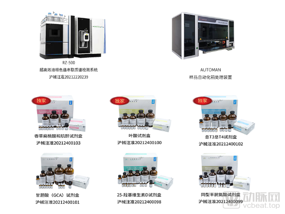 上海睿康生物以自主研发为主,目前不但拥有近百个二类/三类生化试剂盒,还建立了全球领先的质谱试剂研发团队,已成功获批国内最多的6项二类试剂盒(其中3个为独家产品),并有多个全球独家的二类/三类试剂盒正在注册中。同时,通过与美国赛默飞世尔科技公司(赛默飞)合作,研发并注册成功了一款超高效液相色谱串联质谱检测系统RZ-500。RZ-500采用国际领先的质谱技术,其灵敏度、分辨率和扫描速度均领先于临床同类产品,能够覆盖从低端到高端的所有检测项目,实现进口替代,市场空间广阔。