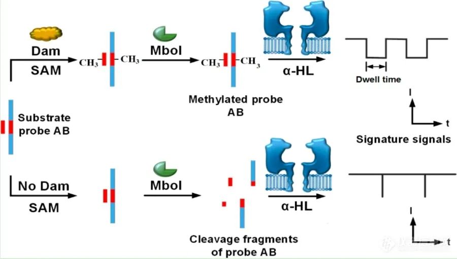 ▲ 用于分析DNA甲基化酶活性的纳米孔试验的示意图