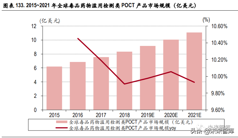 IVD 行业“简单、便捷、个人健康管理”方向发展之 POCT 1、POCT 行业概述 POCT(Point-of-Care Testing,即时检测)通常被定义为一种在采样现场进行的、利用便携式分析仪器 及配套试剂快速得到结果的检测方式。其核心要素在于满足临床治疗或家用监护的快速诊断需求, 以快速、即时得到可信赖的诊断结果为最终目标,与传统诊断互补。 根据检测条件和环境的不同,体外诊断行业分为专业实验室诊断和即时诊断(Point-of-Care Testing , POCT 通常被定义为一种在采样现场进行的、利用便携式分析仪器及配套试剂快速得到结果的检测方 式。其核心要素在于满足临床治疗或家用监护的快速诊断需求,以快速、即时得到可信赖的诊断结 果为最终目标,与传统诊断互补。)专业实验室诊断是指在检验科或独立实验室使用自动化和高通 量的仪器进行大样本量的检测,临床实验室体外诊断需由专业人员完成,耗时较长,但检测结果质 量较高。即时诊断(POCT)则是在采样现场进行的、利用便携式分析仪器及配套试剂快速得到检测 结果的一种检测方式。POCT 的操作者可以是非专业检验师,甚至是被检测对象本人。由于 POCT 无 需中心实验室,可直接在患者身旁进行检测,能快速进行诊疗、护理、病程观察,进而提高医疗质 量,故在 ICU、手术、急诊、诊所及患者家中渗透率均逐步提高。POCT 即时诊断作为新兴诊断领域 近年来发展迅速,未来发展前景广阔。抗原和抗体是 POCT 试剂的核心原料,其性能影响着 POCT 试 剂的关键性能指标,在很大程度上决定了 POCT 试剂性能的上限。POCT 试剂所需通常抗原抗体分为 两类,一类是特异型抗原抗体,一类是通用型抗原抗体。特异型抗原抗体主要利用抗原抗体的特异 性结合反应,识别样本中是否存在相应待检物质;通用型抗原抗体主要在检测中起辅助作用,如用 于质控线,提高产品灵敏度与特异性等。 从检测项目来看,POCT 检测包括血糖检测、心脏标志物检测、优生优育检测、感染因子检测、传染 病检测、糖化血红蛋白测定、凝血测试等。从细分领域增速来看,心脏标志物、传染病 POCT 产品 正处于快速成长期,需求增速较快,未来发展空间大。这是由于抢救心血管类病人在时效性上的要 求比其他疾病救治要求高的多,而 POCT 凭借检测速度快的最大特色满足了这一需求,因此心血管 类检测成为 POCT 发展最快的应用。而传染类 POCT 主要是针对各类常见传染病及重大传染病等基层 现场筛查、快速检测的产品,主要包括艾滋病、梅毒、病毒性肝炎、疟疾、流感等传染病的快速检 测产品。传染病因其传染性、流行性、地域性、季节性等特点,在全球范围引起不同程度的关注, 我国也逐渐加大了对重大传染病的预防和监控力度,POCT 产品已经成为相关工作的重要工具。 目前,我国 POCT 产品总体而言处于成长期,其中市场增速比较快的有感染类、心脏标志物等细分 领域,虽然血气也属于比较成熟的市场,但是国产企业很少涉及。心脏标志物、凝血、糖尿病、血气产品均是处在成长期,在国际上糖尿病和心脏标志物产品已经进入成熟期,未来我国这些产品还有很大的上升空间。 随着互联网、医疗信息化的介入,近几年 IPOCT 概念出现,有利于基层医疗设备的数据化和诊断水 平的提升。易用性、即时性和样本类型灵活选择,是过去 POCT 提升的路径,不同子行业所处的生 命周期也不同,其中增长最快的细分为 FOB(粪便检测)、糖化血红蛋白,增长最慢的为早孕检测。在 家用市场和专业市场,主流产品分布具有不同的格局。 从目前市场份额占比来看,感染类及心脏标志物类 POCT 占总产品(除血糖)份额最高,紧接着是血气类、妊娠、其他快检类。总体来看感染和心血管产品目前仍然是处于成长期,未来随着胸痛中心、脑卒中心等中心的建立,其市场份额将持续增长。未来会有更多 POCT 产品进入家庭,行业总容量不断扩充。 2、 POCT 市场规模分析 2.1 毒品及药物滥用检测领域 毒品及药物滥用检测类 POCT 产品主要以定性类产品居多,以金标法进行尿液或唾液检测为主,广 泛用于戒毒所、医院、征兵、海关边检和公路交通安全中高危人群普查、特种行业和招工体检的筛 查工作。根据联合国毒品和犯罪问题办公室发布的《2018 年世界毒品报告》,全球毒品市场正在逐年扩大, 可卡因和鸦片产量达到绝对纪录高点,2016 年全球可卡因产量估计为 1,410 吨,达有史以来的最高水 平;2016 年至 2017 年,全球鸦片产量激增 65%,达到 10,500 吨,是二十一世纪初开始监测全球鸦片 产量以来记录的最高估计数;大麻是 2016 年消费最广泛的毒品,至少有 1.92 亿人使用过一次,全球 大麻使用者人数继续上升,截至 2016 年的十年间,全球大麻用量增长了约 16%。此外,海洛因和可 卡因等毒品越来越多地与新型精神活性物质和处方药共存,许多来源不明的非医疗用途药物制剂, 以及多种药物使用和多种药物贩运,使毒品问题变得空前复杂。 在全球化的毒品市场条件下,毒品 扩散到其他许多地区的风险不断提升。2000 年至 2015 年,全球直接因吸毒导至的死亡人数增加了 60%,其中 50 岁以上的死亡人数占比从 2000 年的 27%上升至 2015 年的 39%。在我国,根据《2018 年中国毒品形势报告》数据显示,截至 2018 年底,全国现有吸毒人员 240.4 万 名,虽然吸毒人数比例较欧美和东南亚国家相比较低,但毒品滥用问题总体仍呈蔓延之势,尤其