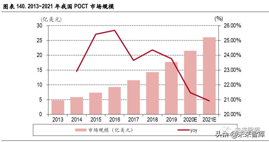 我国 POCT 行业起步较晚,2004 年 POCT 概念及技术才首次引入中国,2006 年我国成立 POCT 分委员 会。2013 年 10 月国家质量监督检验检疫总局和国家标准化管理委员会发布了《GB/T29790-2013 即时 检测质量和能力的要求》,将 POCT 命名为“即时检测”,该标准于 2014 年 2 月 1 日起实施,行业目前 整体仍处于发展初期,市场规模不大,医院临床科室渗透率还较低,尤其是在基层及个人用检验设 备不多,相对欧美日等发达国家整体市场规模仍然偏小。而且受益于国内经济的快速发展和医疗体 制的不断革新,我国整体医疗器械市场正处于快速发展阶段,同时随着分级诊疗等制度的推进落实, 医院对于 POCT 产品的需求日益凸显,我国 POCT 产业也迎来市场发展契机,因此具有较大的市场发 展潜力。 2016 年我国 POCT 市场规模仅为61.75亿元,根据 TriMark 预测,2018 年我国POCT产业市场规模为14.3亿美元,此后几年将维持 22%的年复合增速,预计2021年市场规模达到 26 亿美元。由于我国人口基数大,老龄化现象严重,医疗资源地区发展不均衡,中国必将是POCT潜在的发展市场。随着我 国分级诊断政策落实和医疗改革体制的推进,以及居民健康管理意识的不断提高,未来几年我国POCT行业仍将保持较快速度的增长。 随着POCT技术的不断升级、分级诊疗政策的强力推行、国家五大中心建设的逐步完善、临床科室的硬性需求等,将会给 POCT 领域带来新的市场空间。 信息来源:摘录自中银证券,作者:邓周宇