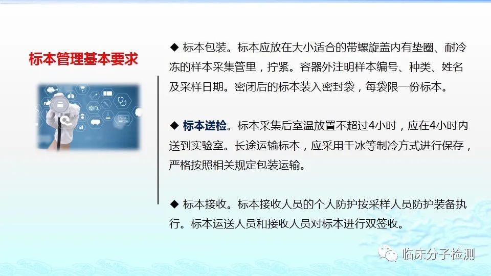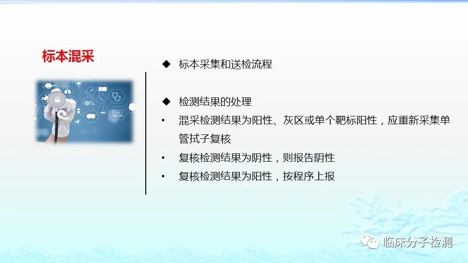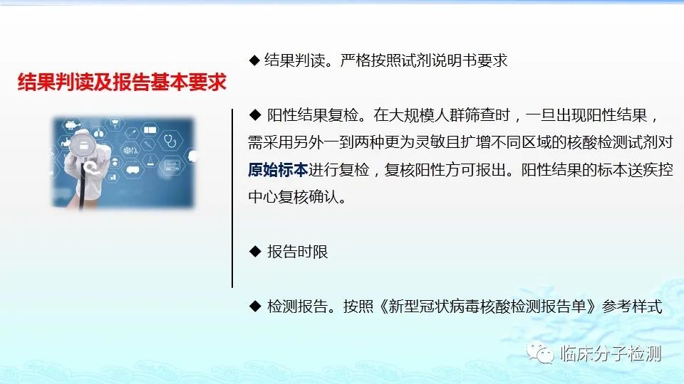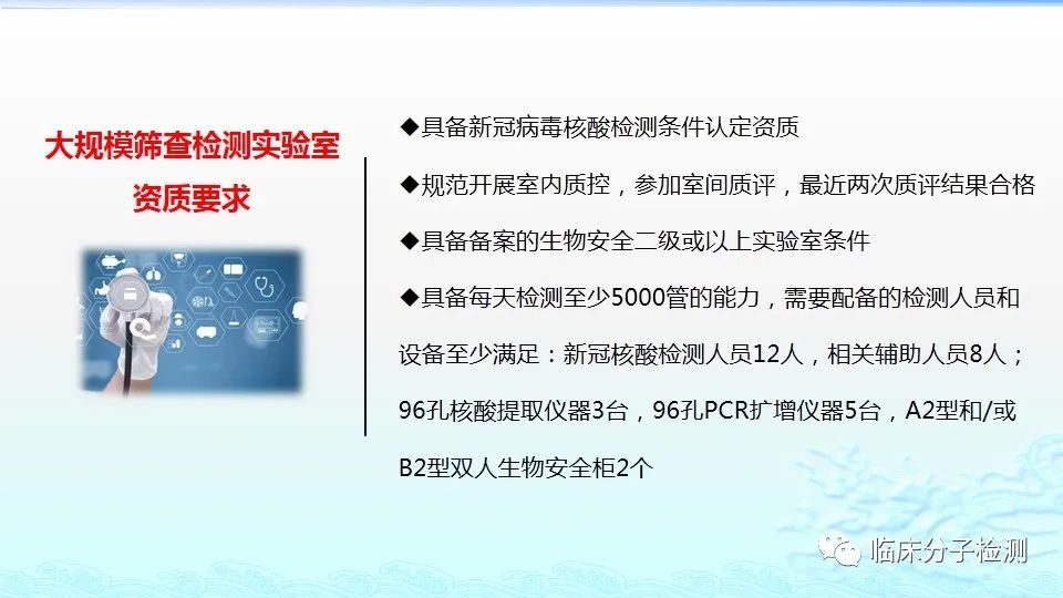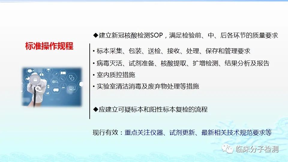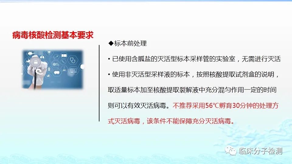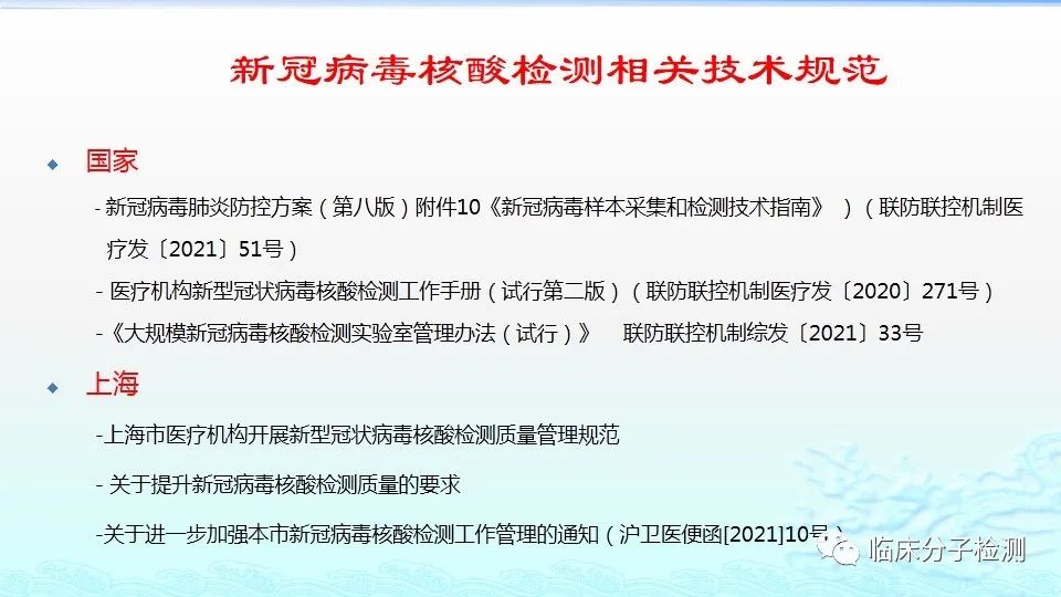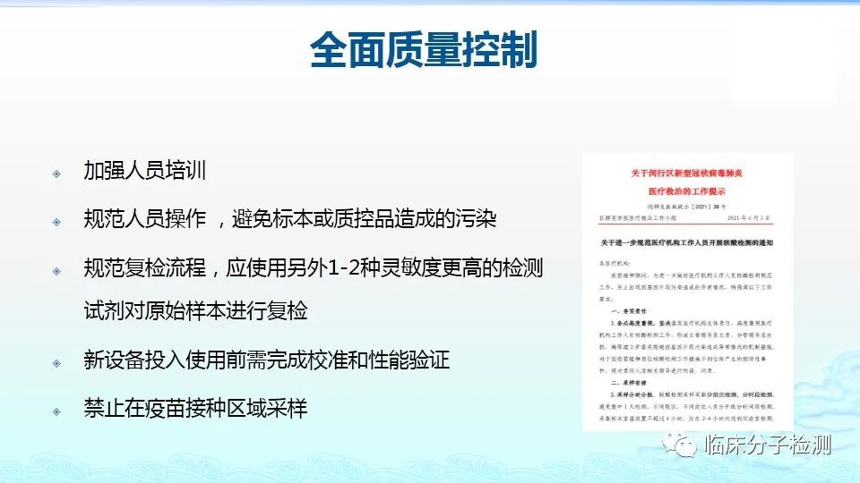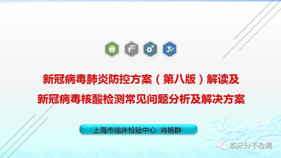 6月22日,在上海市医疗机构新冠病毒核酸检测质量管理专题培训会上,上海市临床检验中心分子室的肖艳群主任为大家做了《新冠病毒肺炎防控方案(第八版)解读及新冠病毒核酸检测常见问题分析及解决方案》的专题报告,重点结合《新型冠状病毒肺炎防控方案(第八版)》及其“附件10《新冠病毒样本采集和检测技术指南》”中内容给大家做了解读,特别是针对新版文件中所提出的新要求,如无症状感染者、入境人员、密切接触者的采样要求、病毒基因测序、实验室检测(如压力梯度建议、核酸提取试剂选择建议、病毒灭活方式建议等)要求等做了详细说明。此外,肖老师还对新冠病毒核酸检测常见问题分析及解决方案做了详细介绍。 |