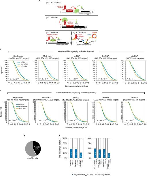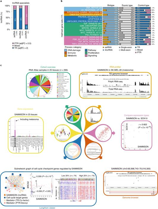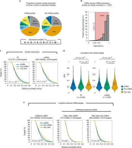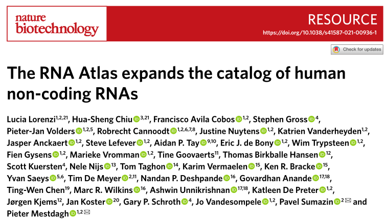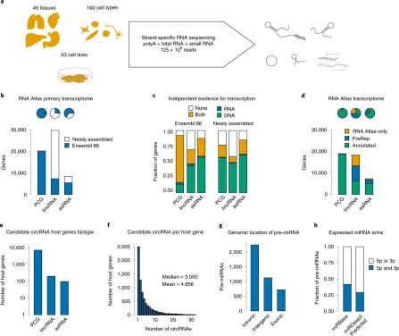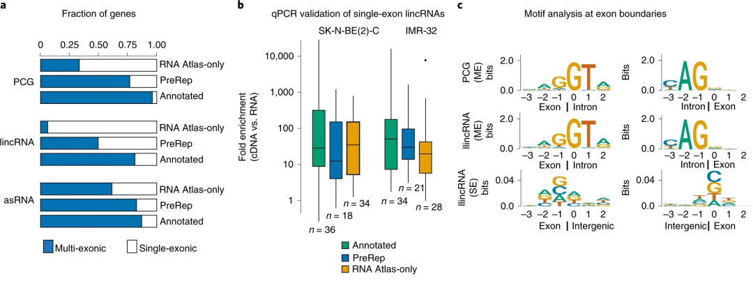 非编码RNA(Non-coding RNA,ncRNA)是指不编码蛋白质的RNA,包括大量的调控性ncRNAs,例如microRNAs(miRNAs)、长非编码RNAs(lincRNAs)、反义RNAs(asRNAs)和环状RNAs(circRNAs)等被发现是人类发育和疾病(包括癌症)的潜在参与者。目前,对RNA特征调控机制和基因功能的研究主要依赖于小和多聚腺苷酸化的RNA转录组的分析,对非多聚腺苷酸化、环状转录物及其与其他RNA生物型关系仍待进一步系统探究。 近日,比利时根特大学医学遗传学中心Pieter Mestdagh研究团队在Nature biotechnology发了题为“The RNA Atlas expands the catalog of human non-coding RNAs”的研究文章。研究团队历经五年多的努力,利用三种互补的RNA测序技术,包括针对小RNA、多聚腺苷酸(polyA)RNA的测序技术和全RNA测序技术,分析了300种人类细胞和组织类型的转录组,报告了数千个此前未被鉴定的ncRNAs,包括一类新的非多聚腺苷酸单外显子基因和许多新的环状RNA,使ncRNAs数量增加了约8%,完善和扩展了人类ncRNAs及其调控相互作用的现有目录,提供了一个更全面的人类转录组图谱。 文章发表于Nature biotechnology 转录组的组装由Ensembl注释,包括已知和新组装的PCG、lincRNAs和asRNAs。大多数Ensembl和新组装的基因与转录起始位点(TSS)500个碱基对内的CAGE峰或相关染色质状态密切相关。该转录组由18962个PCG、18364个lincRNAs和7374个asRNAs组成。研究人员将RNA图谱基因集分类为Annotated、PreRep或RNA Atlas-only图谱,发现此前未在RNA图谱中预测和注释的lncRNA启动子分别为46%和49%。几乎所有的circRNA(98%)都来自PCG宿主。在小RNA测序分析中,研究人员确定了5213个候选miRNAs(图1)。 图1.RNA图谱转录组的产生和注释。来源:Nature biotechnology 大多数PreRep和RNA图谱仅lncRNAs是lincRNAs,其中大多数是单外显子基因。与多外显子lincRNAs和PCGs相似,单外显子lincRNAs的平均外显子搁浅率为96%。单外显子lincRNAs通常从转录组组件中移除,以防止污染DNA。研究人员通过双链RNA测序工作流程中的测序发现,单外显子lincRNAs不是来源于污染的DNA片段,表明RNA图谱中的单外显子lincRNAs并不是多外显子基因的片段。单外显子和多外显子RNA图谱仅基因显示几乎相同的表达分布。 大多数RNA图谱的基因是ncRNAs,该研究揭示了少数新的候选PCG,确定了104个未被注释的候选PCG,比已知PCG更具组织特异性,外显子更少,ORF长度更短(图2)。 图2.RNA图谱转录组记录了许多单个外显子lncRNAs,并显示了未注释的PCG。来源:Nature biotechnology 研究人员利用polyA和总RNA测序数据测试了RNA图谱基因的多聚腺苷酸化状态。结果发现,大多数PCG(93%)被归类为聚腺苷酸化。对于lincRNAs和asRNAs,多聚腺苷酸化基因的比例分别为48%和63%。值得注意的是,超过75%的RNA图谱和60%的PreRep单外显子lincRNAs被归类为非多聚腺苷酸化,聚腺苷化基polyA-minus/polyA 计数比聚腺苷化基因显著增高,表明整合polyA和总RNA测序数据可以发现非多聚腺苷酸化基因。 此外,研究团队鉴定了160个基因,包括83个PCG、36个lincRNAs和41个asRNAs。结果显示,其中57个基因可变的多聚腺苷酸化状态可能是由选择性多聚腺苷酸化亚型的差异表达驱动的,剩余的103个基因未表现出变化,表明可能是其他机制参与了多聚腺苷酸化的变化。 RNA图谱表达数据反映了转录组的一些既定特征,如非编码RNA表达特异性、印迹和肿瘤融合基因表达。分析发现,与非恶性细胞类型和组织相比,癌细胞系中mRNA融合基因呈现强烈富集。在RNA生物型丰度标准化后,ncRNAs的表达方式比PCG更具组织特异性。 研究人员对基因表达谱、RNA生物型和细胞亚型之间的关系进行了评估。基于PCG表达谱的聚类结果表明,密切相关的细胞类型具有相似的转录组。其中上皮细胞、内皮细胞、成纤维细胞和间充质细胞聚集在一起,不同于RNA图谱数据集中其他细胞类型的转录谱。以上结果表明,RNA图谱基因,包括miRDeep2-预测的候选miRNAs和单个外显子lincRNAs,显示出与样本本体关系密切相关的表达模式。此外,这些非随机表达模式也支持RNA图谱单外显子lincRNAs不是来自污染RNA测序库的DNA片段。 内含子和外显子的表达谱都可以准确地估计出总RNA谱中成千上万的RNA图谱转录物。为了进一步研究RNA图谱中转录和转录后调控的影响,研究人员收集了210个TFs和224个miRBase miRNA的TF和miRNA靶点。正如预期的那样,miRNA表达谱与靶mRNA/pre-mRNA比值(m/p比值)的相关性显著高于与靶pre-mRNA 和mRNA表达谱的相关性(图3)。表明总RNA转录组有助于利用内含子表达谱研究调控模式。 图3.总RNA转录组有助于利用内含子表达谱研究调控方式。来源:Nature biotechnology 随后,研究团队深入了解了lncRNA的功能,利用LongHorn推断RNA图谱lncRNAs下游的调控网络。通过基于ENCODE ChIP-seq47的TF-靶相互作用和基于序列分析的TF结合基序和MiRNA-靶相互作用(图4)。结果表明,所有的lncRNA生物型,包括单个外显子lncRNAs和非多聚腺苷酸化的lncRNAs,都能有效地改变TF和miRNA的调控。 图4.lncRNAs调控的证据。来源:Nature biotechnology LongHorn对lncRNA调控模型的分析表明,circRNAs主要是转录后诱饵,其他lncRNAs主要调节转录(图5)。虽然不是所有circRNAs都是诱饵,但分析结果表明circRNAs在细胞质中富集,lncRNAs在细胞核中富集。在所研究的1221个外显子lncRNAs中,960(79%)被预测至少调节一种相互作用。同时,研究人员根据lncRNAs在hallmark通路中的富集程度以及作为转录或转录后调节剂的特异性对其进行了分类,发现总共有17条途径富含至少5个lncRNAs的靶
