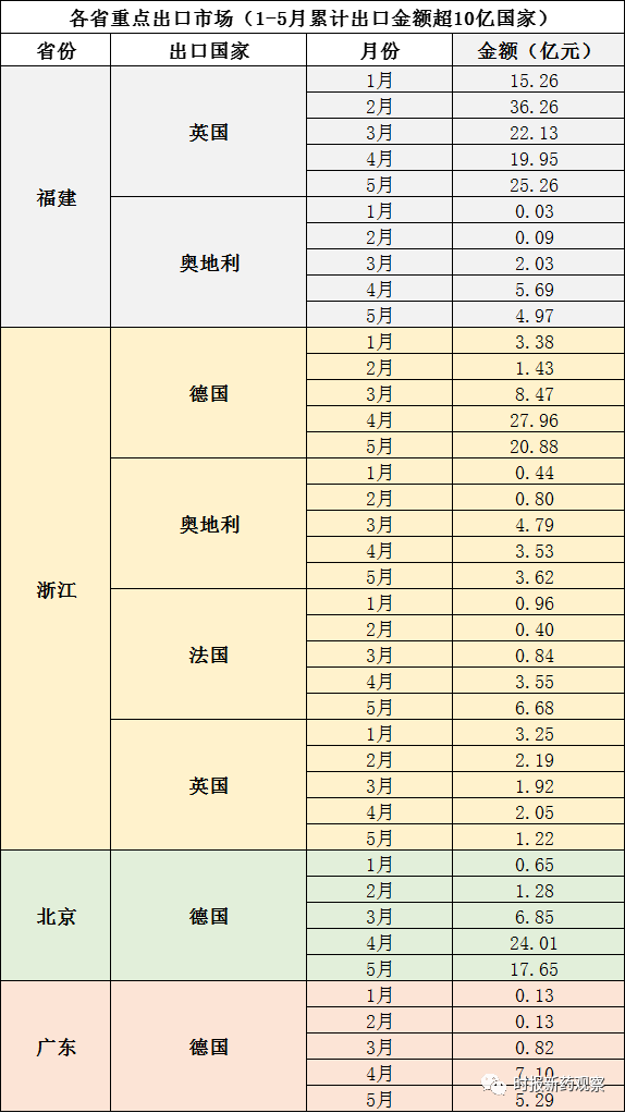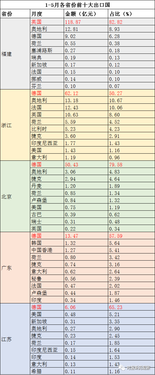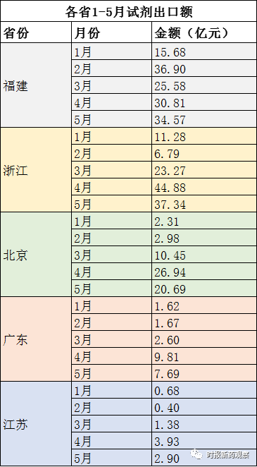 证券时报记者根据中国海关总署重点商品进出口数据统计显示,2021年1-5月,我国主要诊断试剂产品出口额达到428.46亿元,其中以30021500为代表的试剂产品出口额为389.14亿元。 据了解,HS编码30021500的产品主要为新冠抗原、抗体诊断试剂产品,去年四季度后,抗体试剂需求已很少,2021年出口的测试试剂以抗原为主。 去年底,海关总署发布《关于新冠病毒检测试剂盒等疫情防控物资申报相关事项的公告》,公告增列商品编码“3002.1500.50”,商品名称为“以免疫制品为基本特征的新型冠状病毒(COVID-19)检测试剂盒,已配定剂量或制成零售包装”。 福建、浙江、北京出口位列前三 统计发现,今年1-5月,我国试剂出口集中在在福建省、浙江省和北京市,前三个名共占据了近85%的份额。其中福建为143.53亿元,浙江为123.56亿元,均超百亿。 出口市场高度集中在英国、德国 在出口金额居前的5个省份中,出口市场高度集中,部分省份的出口额几乎只来自一个国家。 福建省的试剂出口或主要由厦门宝太贡献。去年,厦门宝太与美国Innova签到了独家合作协议。根据协议,Innova的新冠抗原试剂由厦门宝太独家生产。lnnova是全球最大的新冠试剂制造商,其快速抗原试剂在英国被广泛使用。 浙江省试剂出口或主要由东方生物、艾康生物等贡献。据了解,东方生物除了以自身和美国子公司衡健名义出口外,还为诊断试剂行业头部企业德国西门子、法国biosynex代工快速抗原试剂,日均产能达到数百万份。同时,东方生物还是英国卫生部采购新冠抗原检测试剂的重要供应商之一,其新冠自测试剂于近期取得英国EUA认证。艾康生物是少数国内较早取得CE自测认证的企业,并进入了英国卫生部《通过验证的新冠抗原试剂盒产品名单》。 北京市有热景生物、万泰生物、乐普医疗等IVD出口企业。热景生物此前曾公告表示,今年3月初,公司的新冠抗原试剂获得德国联邦药品和医疗器械研究所(BfArM)用于居家自由检测的认证,可以在德国的商超、药店、互联网商店等销售,导至外贸订单爆发式增长。6月2日,热景生物公告,德国认证延长至2021年9月2日。