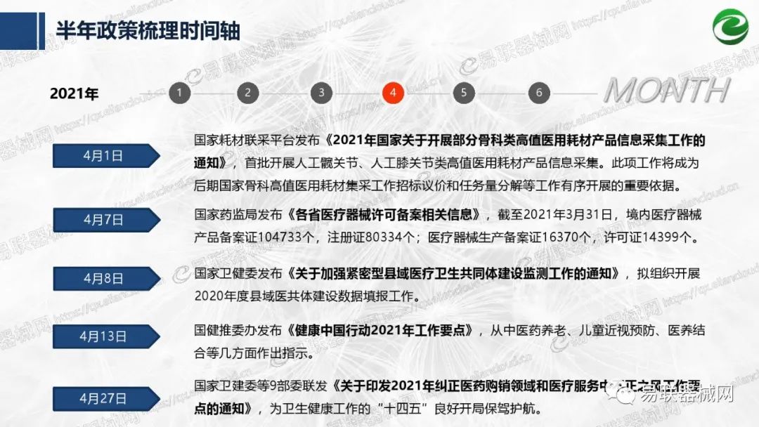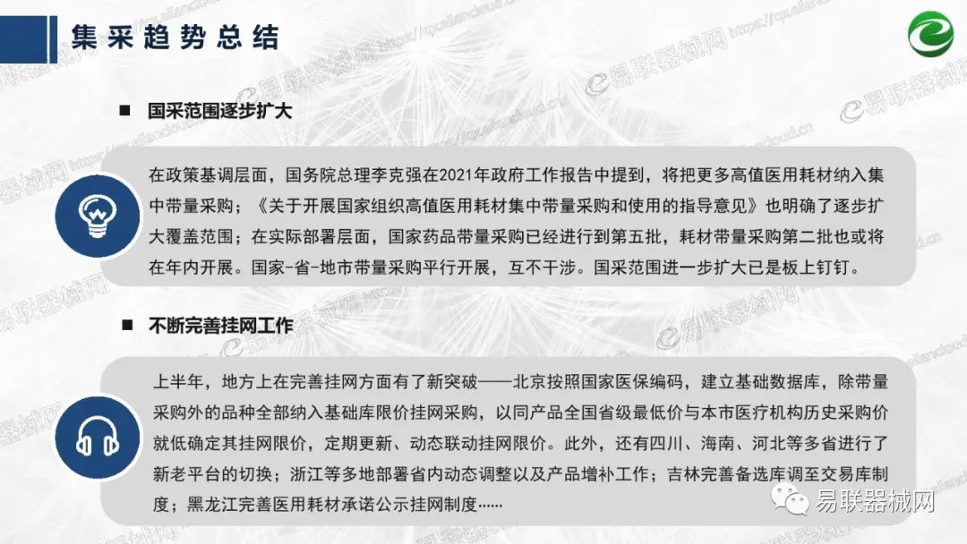 带量采购方面:2021年上半年,带量采购持续发力,仍是行业内的焦点所在。首批带量采购项目即将届满,相应续标工作有序展开;带量采购常态化、规范化文件相继出台,引领耗材带量采购走向新的篇章…… 常规项目方面:各地挂网工作有序开展,新老平台切换稳步推进;地方工作上:北京耗材限价挂网、内蒙古简化挂网流程、四川与江西规范并完善药耗集采工作、河南持续推进阳光挂网、海南实行“红黄绿”价格预警…… 政策方面:八部委联合印发带量采购规范文件,指导高值医用耗材集中带量采购;信用评价制度建立,严厉打击医疗行业不正当利益关系;医疗服务价格改革试点方案发布,建立合理补偿机制,稳定调价预期;医疗器械唯一标识第二批实施工作即将开展;《医疗器械监督管理条例》修订发布,旨在保障医疗器械安全、推动行业健康发展…… |