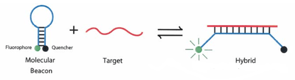 2)SYBR荧光染料: 在PCR反应体系中,加入过量SYBR荧光染料,SYBR荧光染料非特异性地掺入DNA双链后,发射荧光信号,而不掺入链中的SYBR染料分子不会发射任何荧光信号,从而保证荧光信号的增加与PCR产物的增加完全同步。SYBR仅与双链DNA进行结合,因此可以通过溶解曲线,确定PCR反应是否特异。 3)分子信标 是一种在5和3末端自身形成一个8个碱基左右的发夹结构的茎环双标记寡核苷酸探针,两端的核酸序列互补配对,导至荧光基团与淬灭基团紧紧靠近,不会产生荧光。 PCR产物生成后,退火过程中,分子信标中间部分与特定DNA序列配对,荧光基因与淬灭基因分离产生荧光。 第二代PCR主要缺点:
