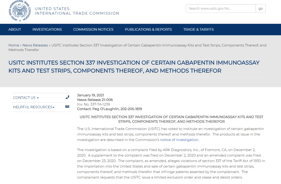 图片来源:https://www.usitc.gov/press_room/news_release/2021/er0119ll1702.htm 2021年1月19日,美国国际贸易委员会(ITC)投票决定对特定加巴喷丁免疫测定试剂盒和试纸及其组成和方法启动337调查(调查编码:337-TA-1239)。 2021年4月15日,美国国际贸易委员会(ITC)发布终裁:对本案行政法官于2021年3月31日作出的初裁(No.11、12)不予复审,即基于同意令,终止对列名被告美国12PanelMedical, Inc., Sarasota, FL、美国12Panel Now, Inc., Sarasota, FL、美国Hospital Connect, Inc.,Boynton Beach, Florida、美国TransMed Co., LLC; Alpharetta, GA的调查。 2021年4月22日,美国国际贸易委员会(ITC)发布公告称,对特定加巴喷丁免疫测定试剂盒和试纸及其组成和方法(调查编码:337-TA-1239)作出337部分终裁:对本案行政法官于2021年4月9日作出的初裁(No.14)不予复审,即基于同意令,终止对列名被告美国Mercedes Medical, LLC of Lakewood Ranch, Florida的调查。 关于美国337调查: 美国337调查是根据美国《1930年关税法》,美国国际贸易委员会(United States International Trade Commission, USITC)可以对进口贸易中的不公平行为发起调查并采取制裁措施。由于其所依据的是《1930年关税法》第337节的规定,因此,此类调查一般称为“337调查”。337调查的对象为进口产品侵犯美国知识产权的行为以及进口贸易中的其他不公平竞争。实践中,涉及侵犯美国知识产权的337调查大部分都是针对专利或商标侵权行为,少数调查还涉及版权、工业设计以及集成电路布图设计侵权行为等。其他形式的不公平竞争包括侵犯商业秘密、假冒经营、虚假广告、违反反垄断法等。 美国国际贸易委员会USITC负责进行337调查,该机构是美国国内一个独立的准司法联邦机构,拥有对与贸易有关事务的广泛调查权。其职能主要包括:以知识产权为基础的进口调查,并采取制裁措施;产业及经济分析;反倾销和反补贴调查中的国内产业损害调查;保障措施调查;贸易信息服务;贸易政策支持;维护美国海关税则。 |
