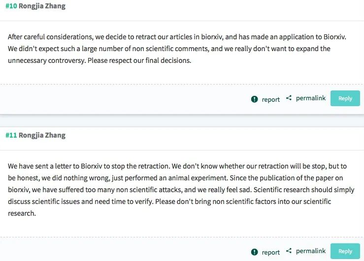 7月5日,澎湃新闻记者注意到,针对论文引起的争议,张荣佳在学术交流社区PubPeer上有过多次解释和回应。近期一条留言中,张荣佳称“经过认真考虑后,我们已向BioRxiv提交了撤稿请求”。 不过,最新的另一条留言,张荣佳称已向BioRxiv写信停止撤稿,但不确定最终会不会停止。