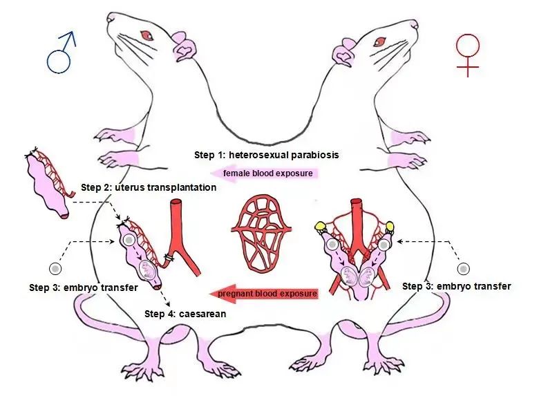 论文中介绍了试验的四个步骤:首先,研究人员通过手术将阉割的近交系雄性大鼠和近交系雌性大鼠连接起来,形成了一对异性连接共生体。第二,8周后研究人员对雄性共生体进行子宫移植。