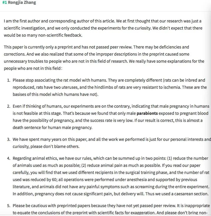 6月上旬,一篇在在线学术期刊bioRxiv预印本发表的研究论文《A rat model of pregnancy in the male parabiont 》让“公鼠怀孕”的话题引起广泛争论。 论文作者为海军军医大学博士张荣佳和教授刘玉环。预印本是指科研工作者的研究成果还未在正式出版物上发表,而出于和同行交流目的自愿先在学术会议上或通过互联网发布的科研论文、科技报告等。