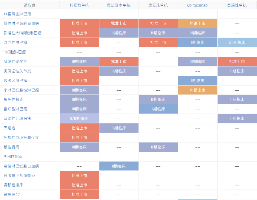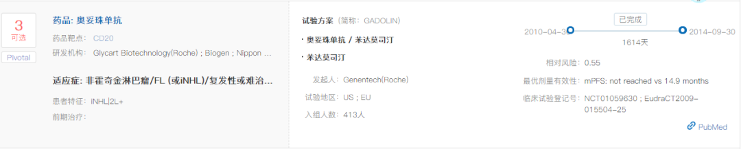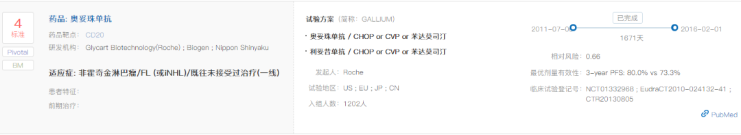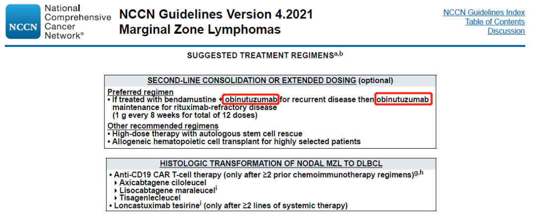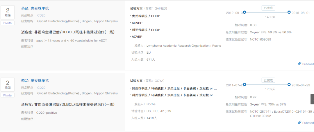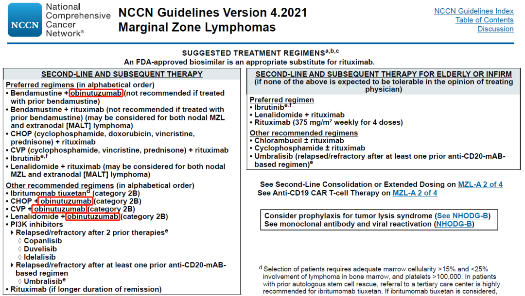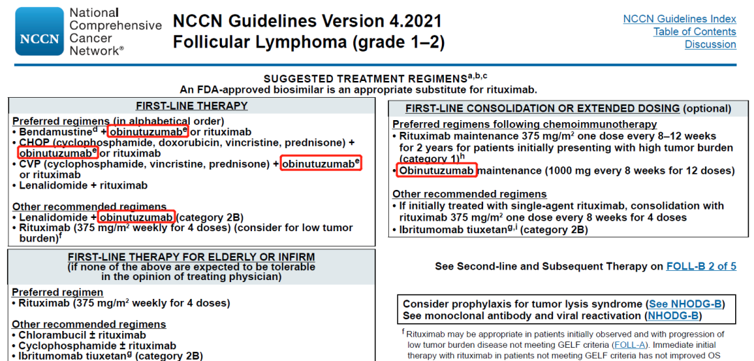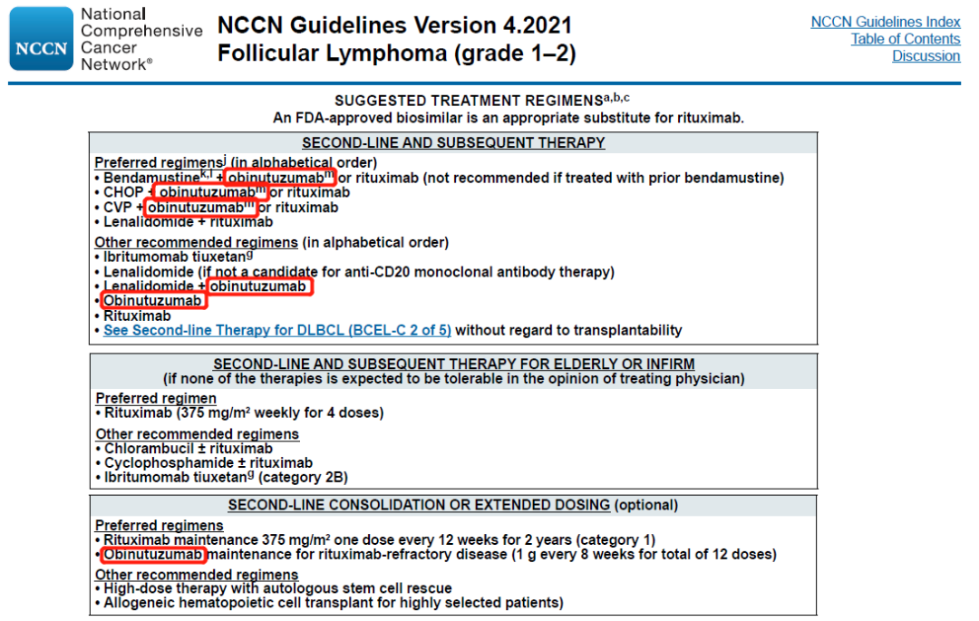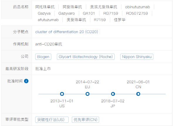 奥妥珠单抗 Q1 基本信息 奥妥珠单抗(obinutuzumab,Gazyva/佳罗华)是Glycart Biotechnology(已被罗氏收购)开发的新一代的anti-CD20单抗,最早于2013年11月上市,是FDA批准的第一个糖基化修饰的单抗,用于治疗慢性淋巴细胞白血病和滤泡性淋巴瘤。 奥妥珠单抗于2019年9月在中国提交进口新药上市申请,于2019年12月被纳入优先审评程序,2021年6月1日正式获NMPA批准用于治疗滤泡性淋巴瘤。 Q2 上市背景 滤泡性淋巴瘤(FL)是一种典型的惰性非霍奇金淋巴瘤(NHL),起源于B淋巴细胞,约占所有NHL病例的17%。 CD20是位于B淋巴细胞表面的一种跨膜磷蛋白,主要在前B细胞到成熟B细胞阶段表达。抗CD20单抗可通过抗体依赖的细胞毒作用(ADCC)、补体依赖的细胞毒作用(CDC)、以及与CD20分子结合抑制细胞生长(直接抑制),发挥杀伤B细胞来源肿瘤的功效。 抗CD20单抗药物自问世以来,经过了一系列的优化和改良。第一代是以利妥昔单抗为代表的人鼠嵌合单抗;第二代是以奥法妥木单抗为代表的全人源单抗,降低了异源性。而奥妥珠单抗则是第三代Fc段经修饰的II型CD20单抗。与利妥昔单抗和奥法妥木单抗相比,奥妥珠单抗CDC效应更弱,但是ADCC、ADCP更强,并且具有更强的直接B细胞杀伤效应。 抗CD20适应症研发布局 Q3 适应症 奥妥珠单抗在FDA获批的适应症为:1)与苯丁酸氮芥联合,用于初治的慢性淋巴细胞白血病患者。2)与苯达莫司汀联合,序贯奥妥珠单抗单药治疗,用于在含利妥昔单抗的方案后复发或难治的滤泡性淋巴瘤患者。3)与化疗联合,用于初治的II期伴有巨大肿块、III期或IV期滤泡性淋巴瘤成人患者,达到至少部分缓解的患者随后的单药维持治疗。 奥妥珠单抗在中国获批的适应症为:与化疗联合,用于初治的II期伴有巨大肿块、III期或IV期滤泡性淋巴瘤成人患者,达到至少部分缓解的患者随后的单药维持治疗。(来源:罗氏公告) Q4 专利布局 原研公司罗氏已针对奥妥珠单抗在中国申请了序列专利(授权公告日2015-5-20,预计专利届满日2024-11-5),该专利保护了奥妥珠单抗的轻链和重链可变区序列;还保护了奥妥珠单抗治疗B细胞淋巴瘤,非霍奇金氏淋巴瘤、B细胞慢性淋巴细胞白血病、类风湿性关节炎和狼疮的用途,同样也保护了奥妥珠单抗的制备方法和药物组合物。 罗氏基于该专利在中国提交了3件分案申请、专利类型均为序列专利,其中两件获得了授权。该专利在美国、日本、欧洲、WIPO等38个国家或组织拥有113件同族专利。 Q5 循证数据及核心临床 在一线治疗滤泡性淋巴瘤(FL)的全球III期临床试验GALLIUM(NCT01332968)中,奥妥珠单抗联合化疗对比利妥昔单抗联合化疗,无进展生存期显著延长(3年PFS率为80.0% vs. 73.3%,HR=0.66;95% CI: 0.51-0.85;p=0.0012),达到主要研究终点。 在一线治疗慢性淋巴细胞白血病(CLL)的全球III期临床试验(NCT01010061)中,奥妥珠单抗+苯丁酸氮芥vs. 利妥昔单抗+苯丁酸氮芥vs. 苯丁酸氮芥的mPFS分别达到26.7 vs. 16.3 vs. 11.1个月。与苯丁酸氮芥单药相比,奥妥珠单抗+苯丁酸氮芥降低疾病进展或死亡风险达82%(HR=0.18;95% CI: 0.13-0.24; P<0.001)。 由上可知,在一线治疗慢性淋巴细胞白血病和滤泡性淋巴瘤的III期临床中,奥妥珠单抗 (G)的有效性优于利妥昔单抗(R);然而,在一线治疗弥漫性大B细胞淋巴瘤的试验中,G-CHOP相比于R-CHOP并未延长PFS。 此外,在二线及以上治疗利妥昔单抗难治性惰性非霍奇金淋巴瘤的III期临床试验GADOLIN(NCT01059630)中,奥妥珠单抗联合苯达莫司汀序贯奥妥珠单抗维持治疗的疗效优于苯达莫司汀单药治疗,中位PFS分别为未达到和14.9个月(HR=0.55;95% CI: 0.40-0.74; p=0·0001)。 根据NextClinTrial数据库,奥妥珠单抗针对慢性淋巴细胞白血病、狼疮性肾炎、膜性肾病的核心临床试验尚在进行之中。 Q6 指南推荐 NCCN诊疗指南:B细胞淋巴瘤V4.2021(滤泡性淋巴瘤): NCCN诊疗指南:B细胞淋巴瘤V4.2021(边缘区淋巴瘤): NCCN诊疗指南:慢性淋巴细胞白血病V4.2021 |
