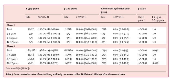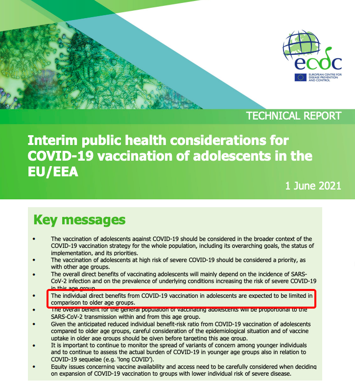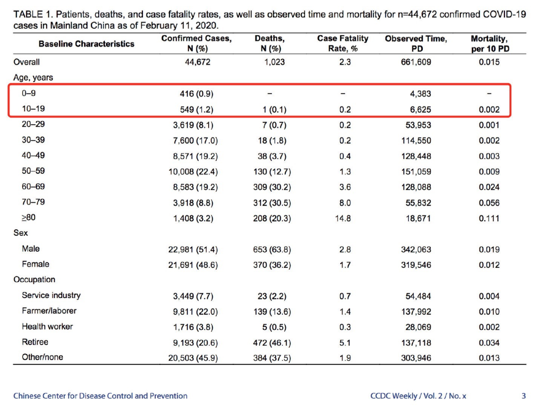 大多数不良反应为轻度至中度,其中最常见的是注射部位疼痛( 13% , 73/550)。有一例严重不良反应报告,经调查诊断认为与疫苗接种无关。 所以安全性方面整体良好。 在免疫原性方面,Ⅰ 期临床试验 1.5 μg 组和 3 μg 组 28 天后 100% 的受试者发生了抗 SARS-CoV-2 中和抗体阳转,中和抗体几何平均滴度 GMT 分别为 55 和 117.4。Ⅱ 期临床试验中,1.5 μg 组和 3 μg 组中和抗体阳转率分别为 96.8% 和 100%,GMT 分别为 86.4 和 142.2。与 1.5 μg 疫苗组相比,3 μg 疫苗组均检测到更强的免疫反应。 参考文献 1 在之前的 18 ~ 59 岁成人和 60 岁及以上老年人的临床试验中,按照相同免疫程序接种两剂次 3 ug 疫苗后 28 天,GMT 分别为 44 和 42,年龄在疫苗诱导的抗体反应中起着重要作用。 进一步的年龄组分析显示,不同年龄间免疫反应不存在显著差异。3 ~ 5 岁、6 ~ 11 岁和 12 ~ 17 岁受试者接种后, 1.5 μg 组阳转率可达到 93% 及以上,3 μg 组阳转率则达到 100%。 这个也符合之前的预期,许多疫苗在儿童和青少年上的免疫应答高于成人,包括辉瑞疫苗、Moderna 疫苗的儿童青少年临床试验也反映了这一点。 因此,儿童和青少年接种疫苗后预防效果,很可能是优于成年人的。 基于以上研究结果,该研究作者支持未来在 3 ~ 17 岁儿童及青少年使用 3 μg 剂量的疫苗。 儿童青少年接种是否需要扩大推广? 对于目前是否有必要在全球范围推荐儿童及青少年大规模接种新冠疫苗这个问题,世界范围内仍然存在一定争议。 其中一个考虑在于,相关研究显示,儿童感染新冠的感染比例、重症率和死亡率都明显低于中老年群体。 中国 CDC 此前发布的一篇论文分析了新冠肺炎早期超 44000 例中国患者的情况 [8]。在这四万多例病例中,19 岁以下病例不到 1000 例,占比 2.1%,其中出现 1 例死亡;9 岁以下新冠患儿有 416 人,无一例死亡。 图源:参考文献 8 欧洲 CDC 本月对儿童(12 ~ 18岁)接种疫苗发布的指导显示,相对于成年人的新冠疫苗接种指导,对儿童的接种指导要更加谨慎一些:「与年龄较大的人群相比,儿童接种新冠疫苗的个人直接获益预计相对有限。」[9] 图源:参考文献 9 去年 12 月,美国 FDA 在审批辉瑞疫苗时,最终以 17 票赞成、4 票反对和 1 票弃权通过了辉瑞疫苗,其中,反对和弃权的理由主要集中在年龄下限的确定(16 岁)。不过在今年 5 月,美国 FDA 已经批准辉瑞疫苗接种人群扩大到 12 ~ 15 岁人群 [4]。 另一方面,给儿童及青少年接种新冠疫苗的实际效果在不同国家可能也存在区别,主要原因在于人口比例,比如一些发达国家儿童青少年占比较低,接种效果可能不如发展中国家。 总体来看,扩大新冠疫苗接种至儿童和青少年是可行的方案,科兴疫苗表现出良好的安全性和有效性,这个研究结果也为我们提供了重要的数据参考。 至于具体接种推广策略,则需要根据各个国家地区的疫情情况和人群构成 ,因地制宜地有序推动。 致谢:本文经 重庆市南岸区疾病预防控制中心主管医师 朱玲 专业审核 |