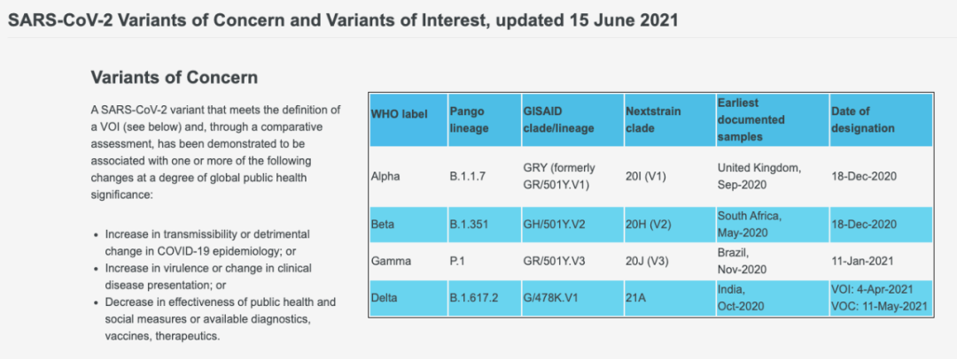 图源:our world in data 以色列几乎把能打的人都打了,剩下接近 35% 的人,要么是没法打疫苗的,要么是坚决不想打疫苗的。 这个数据给我们的一个启示是:即便高度重视并强力推动疫苗接种,一个地方的疫苗接种覆盖率也存在瓶颈,即一定的上限。 那么,这个接种覆盖率的上限是不是能实现新冠群体免疫的目的呢? 近期 Delta 变异毒株的传播中,主要的、重症的病人多为老年人,同时也有孩子。也就是说,16 岁以下的儿童和青少年感染新冠病毒,进而在新冠病毒社区传播中发挥作用的隐患是否持续存在?这个问题需要被关注。 WHO 将新冠病毒中的 4 种全球关注变体(VOC)用希腊字母重新命名 (图源:WHO 官网) 也正是基于这样的考虑,不仅我们国家的科兴,很多疫苗都纷纷开展了儿童和青少年的临床试验。 只有这部分人接种了疫苗,疫苗接种率才能突破目前的天花板。 比如辉瑞在 5 月底公布了 12 ~ 15 岁人群接种新冠疫苗的研究结果 [3],美国 FDA 也批准了辉瑞疫苗接种人群扩大到这一群体 [4],Moderna 在相近时间公布了 12 ~ 18 岁人群接种的 I / II 期临床研究结果 [5]。在此基础上,辉瑞和 Moderna 当前都已经将测试群体扩大到了 6 月龄以上的婴幼儿群体 [6,7]。 儿童和青少年接种疫苗的安全性和有效性如何? 要回答第二个问题,我们来具体看看科兴这次新的研究结果。 先说安全性,接种后 28 天内出现任何不良反应的比例: