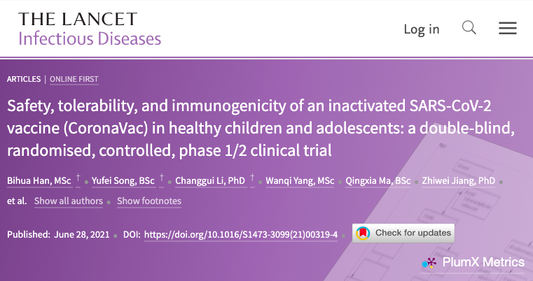本文作者:庄时利和 6 月 28 日,《柳叶刀・感染病学》(The Lancet Infectious Diseases)发表了一项针对 3 ~ 17 岁儿童及青少年接种科兴新冠疫苗 I / II 期临床试验结果 [1],这是首个发布关于 3 岁及以上儿童及青少年人群接种新冠疫苗的临床安全性和免疫原性数据。 今年 6 月初,科兴控股生物技术有限公司董事长尹卫东曾在接受《新闻 1 + 1 》采访时表示,国家已批准科兴新冠疫苗紧急使用年龄扩大到 3 岁以上。 面对这个新发表的研究结果,不少人有两个核心关注点:为什么我们要把新冠疫苗接种扩展至儿童和青少年?儿童青少年接种疫苗的安全性和有效性如何? 为什么要把新冠疫苗接种扩展至儿童和青少年? 以大家都已经比较熟悉的以色列为例。