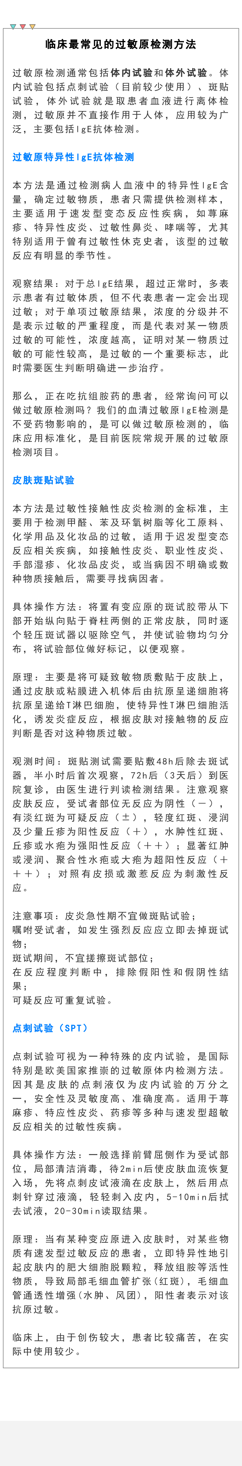 7月8日,是世界过敏性疾病日。近30年来,过敏性疾病的发生率至少增加了3倍,目前全球总患病率已达22%。预计在20年后,工业化国家50%的人口将患上过敏性疾病。过敏,已被世界卫生组织(WHO)列为21世纪重点防治的三大疾病之一。 过敏性疾病又称变态反应性疾病,是指机体收到某些过敏原刺激时,出现的生理功能紊乱或组织细胞损伤的异常免疫反应。比如我们熟知的荨麻疹、特应性皮炎、过敏性鼻炎、哮喘等。 目前为止,过敏性疾病已经成为全球第六大慢性疾病,给许多患者和社会带来了生活和工作的不便,是我们亟待解决的难题。 过敏原种类繁多,最常见的有食入性过敏原和吸入性过敏原,其次为接触性过敏原和输注性过敏原(药物)。食入性过敏原主要有鸡蛋、牛奶、鱼类等,吸入性过敏原包括尘螨、花粉、猫狗皮屑等,接触性过敏原主要有化妆品中的防腐剂、增香剂、合金、染料、橡胶等,输注性过敏原主要指青霉素、链霉素、生物制剂等药物。 那么,许多患者过敏后急切的想知道自己到底是因为什么引起的过敏,其实我们可以通过过敏原检测,知道自己到底对于什么物质过敏,查明过敏原,才可以避免接触。过敏原检测是过敏性疾病预防、诊断、治疗的重要的手段,其检测方法多种多样,各有不同。但是需要注意的是,虽然过敏原检测的物质很多,但是自然界可以过敏的物质千千万万,无法检测出所有的物质。 食物不耐受≠食物过敏 食物特异性lgG检测 食物不耐受是指人体免疫系统把进入人体内的某种食物大分子当作有害物质,并针对这些物质产生过多的保护性免疫反应,产生食物特异性lgG抗体(非lgE介导),lgG抗体与食物大分子形成免疫复合物,引起人体组织发生炎症反应,并表现出如腹痛、腹泻、口腔溃疡、头晕、头痛、高血压、荨麻疹、湿疹等全身各系统症状和疾病。 目前人群中约有45-50%存在不同程度的食物不耐受! 但应注意的是,食物不耐受不是免疫性过敏反应,其症状的发生与食物摄入量、反复多次进食有关,指难以消化或代谢某些特定食物,而见腹泻、腹胀等症状,通常较为隐匿,不易被发现,其不同于食物过敏! 在临床中,很多患者lgE检测为阴性,但是lgG检测为阳性,这类病人如果只进行单一的lgE检测,仍不能找到致病原因,就会延误病情。 观察结果及相应处理: 如何解读检查报告中的阳性结果? 筛查报告显示为阳性的,患者平日食入或接触后,确有过敏反应的,为真阳性;建议患者暂停规避一段时间,然后三至六个月后可重新少量试吃。但对于曾发生严重过敏反应的食物,建议严格忌口,以免发生生命危险! 筛查报告显示为阳性的,但患者平日食入或接触后,无任何过敏反应的,可能为假阳性。建议暂停这些物品一至两周,然后再重新小量尝试。仔细观察患者有无过敏反应之后再做定论。 筛查报告显示为阳性的,而患者从未接触过的食品或物品,建议暂时避免接触此类物品。可在三至六个月之后,少量、递次尝试,以确定是否存在过敏现象。 为什么老有过敏症状,但检测结果却是阴性? 我们在门诊经常会遇到一些拿着过敏原阴性结果的检查单询问医生,为什么一直过敏,却查不到呢?原因有以下两个方面: 其一,可能是此过敏反应,并不是由lgE抗体介导的Ⅰ型过敏反应,有可能是Ⅲ型lgG介导的过敏反应,是隐匿型的过敏反应,那么还需要检测lgG抗体,因此临床上要根据患者情况,选择不同类型的检测,有条件需两者均检测; 其二,也有可能是过敏原种类多样,由于目前过敏原体外检测试剂的生产和抗原包被尚无国际统一的标准,各个厂家包被的抗原组分不同,对患者致敏的组分尚未被包被在过敏原的提取物中,也就是说患者的致敏原是所检测的过敏原之外的其他过敏原,那么检测结果就是阴性了。 因此,如果有明显的进食或者明确的过敏反应,即使过敏原检测结果是阴性,那么此时仍然要以临床发现为主,及时的进行规避与防治。 LgE阳性只能代表患者对该过敏原存在致敏,而致敏是否就一定会出现临床症状呢?患者是否出现过敏反应,与患者的免疫状态、情绪、睡眠、是否合并其他疾病、是否使用了影响免疫功能的药物等密切相关,如果免疫功能等都正常,致敏者可以不发病。 过敏原的预防和治疗 1、建议在过敏高发春秋季节提前检测过敏原,以便明确自己对什么物质过敏,提前做好预防。 2、建议减少去户尘螨花粉暴露的环境,患者症状发作可明显减少,这样很少需要服用抗组胺药,能够将患者控制在症状阈值之下,减少病情急性发作带来的痛苦。 (1)把房间内的毛毯或地毯移除、可以改用防过敏床垫、使用空气净化器等; (2)有猫毛或狗毛过敏的人员,不要让猫、狗进入房间; 总之,对于过敏,平时多注意预防,在明确过敏原后,尽可能的远离过敏原,一旦出现过敏的情况,要及早就医,规范治疗。尽早规范治疗,不仅可以治疗现有的疾病,同时也阻止了病情的发展。 本期专家:北京中医药大学东方医院 杨碧莲 李姝燏 -END- |