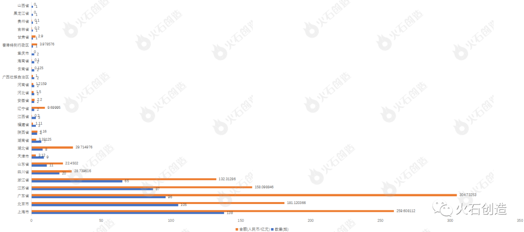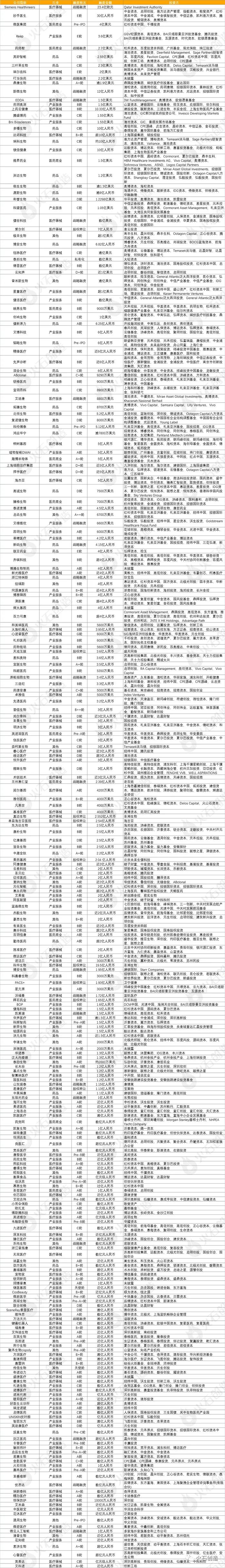 【融资概况】1-6月全国医健领域共发生了578起投融资事件,累计金额超过1151.72亿元。【融资轮次分布】从融资轮次上看,1-6月融资事件大多集中在Pre-A到A++轮,共有186个项目获投。此外,战略融资获得的资金最多,数量仅16.61%的战略融资获得了27.16%的投资金额,高达312.79亿元。 【融资地域分布】1-6月融资项目主要分布在上海市(138起)和北京市(105起)。其中广东省融资金额高达304.73亿元,占总融资金额26.46%。 【融资金额分布】1-6月共578个项目获得投资,累计金额超1151.72亿元,单笔融资金额超过亿元的案例289起,合计融资金额约1109亿元,占上半年融资规模总额的96.29%。【最受投资人欢迎的领域】上半年医疗器械领域最为吸金,融资金额超过371.79亿元,占总融资金额的32.28%。从数量上看,产业服务领域最为活跃。 图 5:2021年1-6月各领域融资数量及金额分布情况1. Siemens Healthineers AG 通过加速簿记增发成功向机构投资者配售了 5300 万股新股。配售价定为每股 44.10 欧元,扣除佣金和费用前的总收益约为 23.4 亿欧元。大约 16.2% 的发行规模分配给了卡塔尔投资局 (QIA)。“通过此次配股,我们成功完成了瓦里安融资的股权相关部分,并实施了最初宣布的融资结构,”西门子医疗集团首席财务官 Jochen Schmitz 博士说。“该交易还将增加自由流通量,从而增加我们股票的吸引力。”2. 2月9日,北京圆心科技集团(后简称圆心科技)正式宣布完成30亿元E轮融资。本轮是继2020年6月D轮融资完成半年后的又一轮融资,由红杉资本中国基金和腾讯联合领投,中信证券、中金资本、OrbiMed、启明创投、鲲翎资本、歌斐资产、易方达基金、指数资本等跟投,指数资本继续担任独家财务顾问。本轮投资方囊括多类型的顶级机构,包括一级和二级市场、TMT和医疗行业、产业资本和财务资本,形成了跨视角的资本共识。本轮融资后,圆心科技将继续深挖服务能力,将资金用于提升公司在互联网医疗、用药管理、健康保险等领域的竞争优势,进一步巩固公司“医-患-药-险”生态服务优势。3. 2月25日,由微医集团分拆出的数字医疗平台微医控股(下称“微医”),在近期完成了超过4亿美元的Pre-IPO融资,估值近70亿美元,该公司最快可能于下月向港交所递交IPO申请。微医该轮融资主要是以红杉资本为代表的老股东加持,及千禧资本等投资机构、大型保险机构的战略性投资。值得一提的是,微医是千禧资本在亚洲参投的首个Pre-IPO轮项目。据了解,以互联网医院为依托,微医开创的数字责任医疗体系正在山东、天津等地区落地并规模化向全国其他区域推广复制。在天津,微医打造了中国首家由互联网医院牵头的省级紧密型医联体,由其旗下互联网医院牵头、协同全市267家基层医疗机构,为用户提供诊前、诊中、诊后全流程医疗和健康维护服务,落实健康责任制。4.运动科技公司Keep已于近日完成3.6亿美元E轮融资,投后估值20亿美金,这距离2020年5月Keep上一轮融资时的10亿美金估值翻了一倍。本轮融资由软银愿景基金领投,高瓴资本、蔻图资本跟投,GGV、腾讯、五源资本、时代资本和BAI资本等老股东也追加了投资。本轮融资过后,2021年Keep还将针对跑步机、运动手环等智能硬件进行迭代升级,持续优化运动小器械品类,并推出更符合中国消费者肠胃的健康食品。本周医健行业活跃投资机构:高瓴创投,红杉资本中国,同创伟业,启明创投,夏尔巴投资,经纬中国,华盖资本