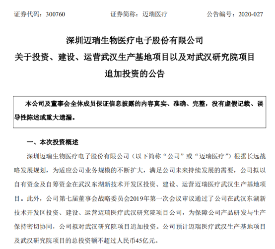 2020年6月19日,迈瑞召开董事会并审议通过了《关于公司投资、建 设、运营迈瑞医疗武汉生产基地项目以及对武汉研究院项目追加投资的议案》。