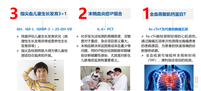 仁迈生物特色项目“三二一” 作为免疫定量分析领域的创新企业,仁迈生物的试剂项目布局极具特色,其中最具代表性的总结起来就是“三二一”,分别为“指尖血儿童生长发育3+1”、“末梢血炎症IP组合”及“全血高敏肌钙蛋白T”。