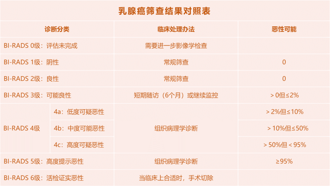 拿到报告单后,你会注意到,在报告单上往往都可以看到一串字母:BI-RADS分级。 BI-RADS分级标准被广泛应用于乳腺的各种影像学检查,如X线钼靶摄影、彩超、核磁共振等,用来评价乳腺病变良恶性程度的一种评估分类法。 BI-RADS分级法将乳腺病变分为0~6级,一般来说,级别越高,恶性的可能性越大。看懂了这个,你也就大概了解了自己乳腺疾病的严重程度。 各个级别的具体含义,如下表所示: 点击图片放大 若筛查结果提示为4级及以上,需要及时到正规医院的乳腺科做进一步地治疗。 |