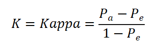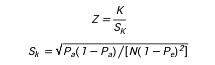 Kappa一致性检验根据定性分析四格表结果,具体方法如下: 其中,Pa为“实际一致率”,Pe为“理论一致率”; 检验统计量Z服从标准正态分位数。N为观察总例数,Sk为K的标准误,K除以Sk,构造出Z统计量,进而可对一致性进行假设检验。K的95%置信区间为(K-1.96Sk,K+1.96Sk)。