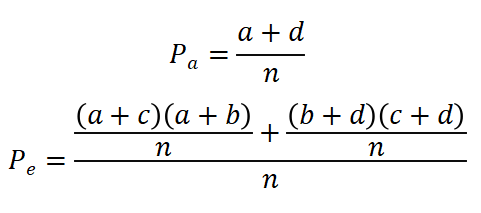 摘要: 刘博这是刘博谈临床第二十五篇,本篇主要对Kappa一致性检验如何实行进行阐述。Kappa一致性检验根据定性分析四格表结果,具体方法如下:其中,Pa为“实际一致率”,Pe为“理论一致率”;n为a+b+c+d。Kappa值的假设检 ...