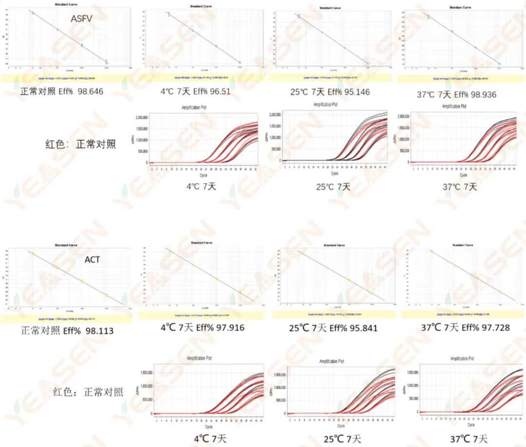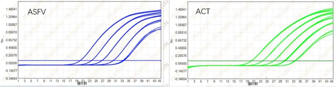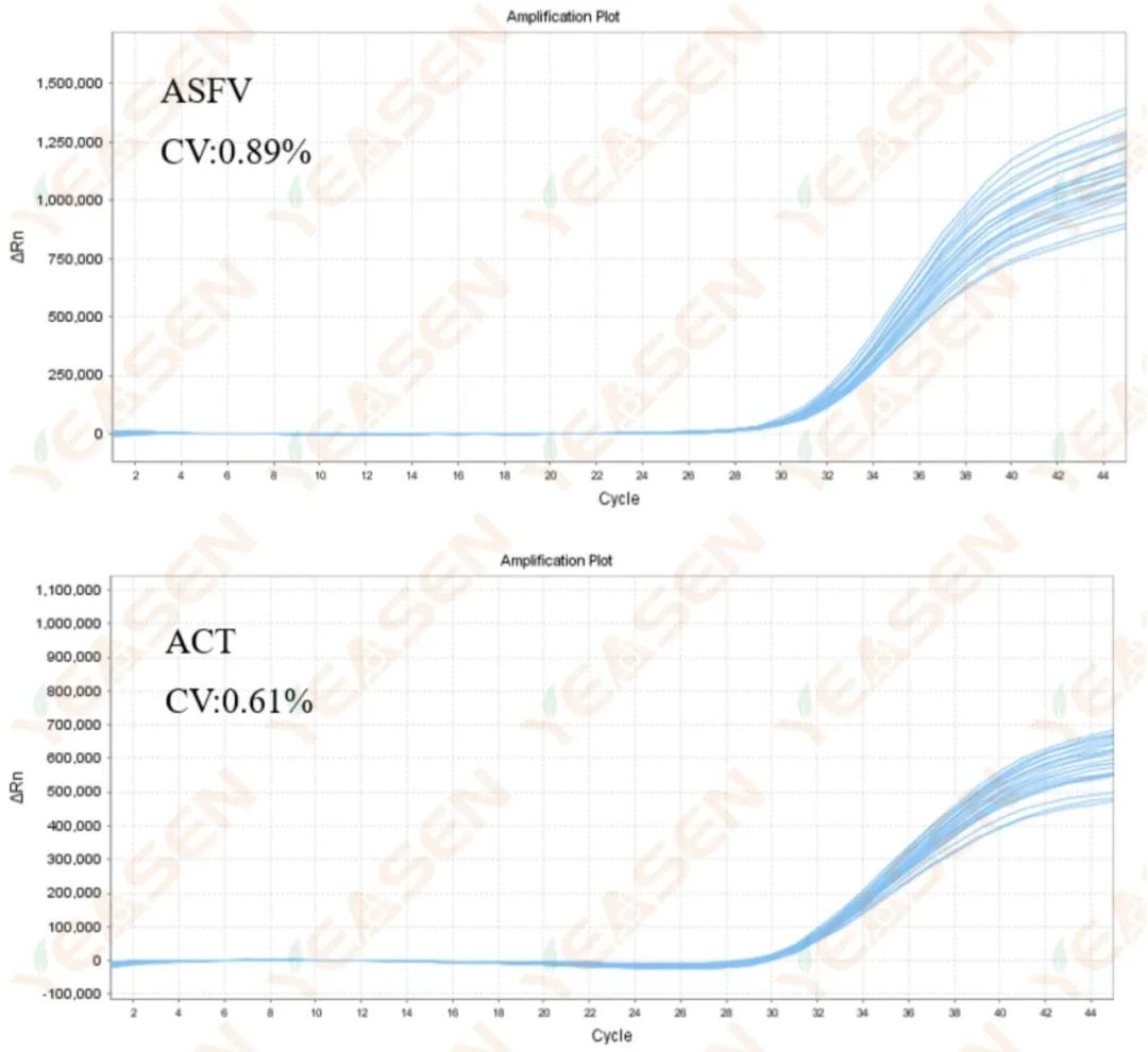 选取Yeasen 探针法qPCR Mix 4个不同批次做20次重复试验,对非洲猪瘟ASFV/ACT双质粒体系进行扩增,发现Ct值无明显差异,CV均小于1%。