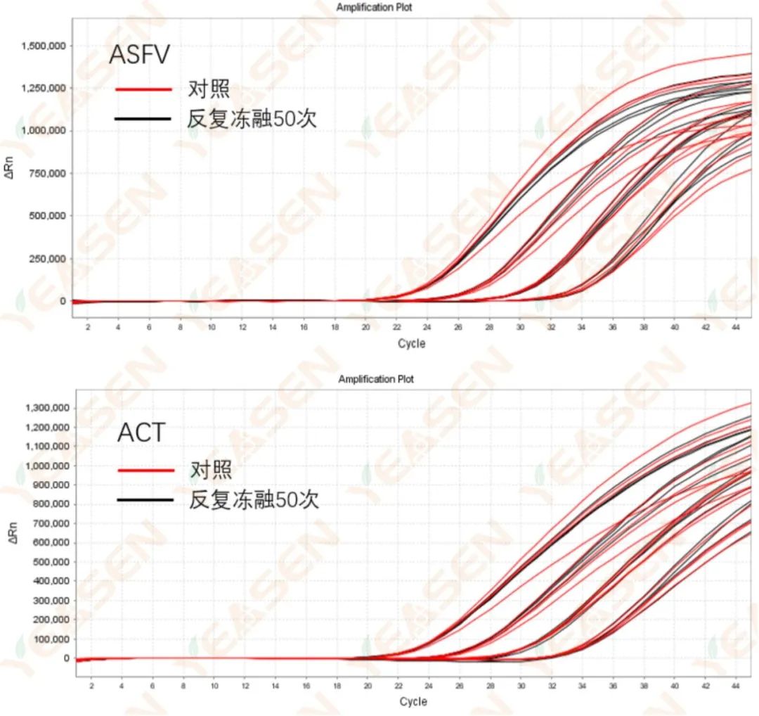 将Yeasen 探针法qPCR Mix反复冻融50次后,对非洲猪瘟ASFV/ACT双质粒样本进行扩增,发现Ct值和荧光值不变化,性能稳定。