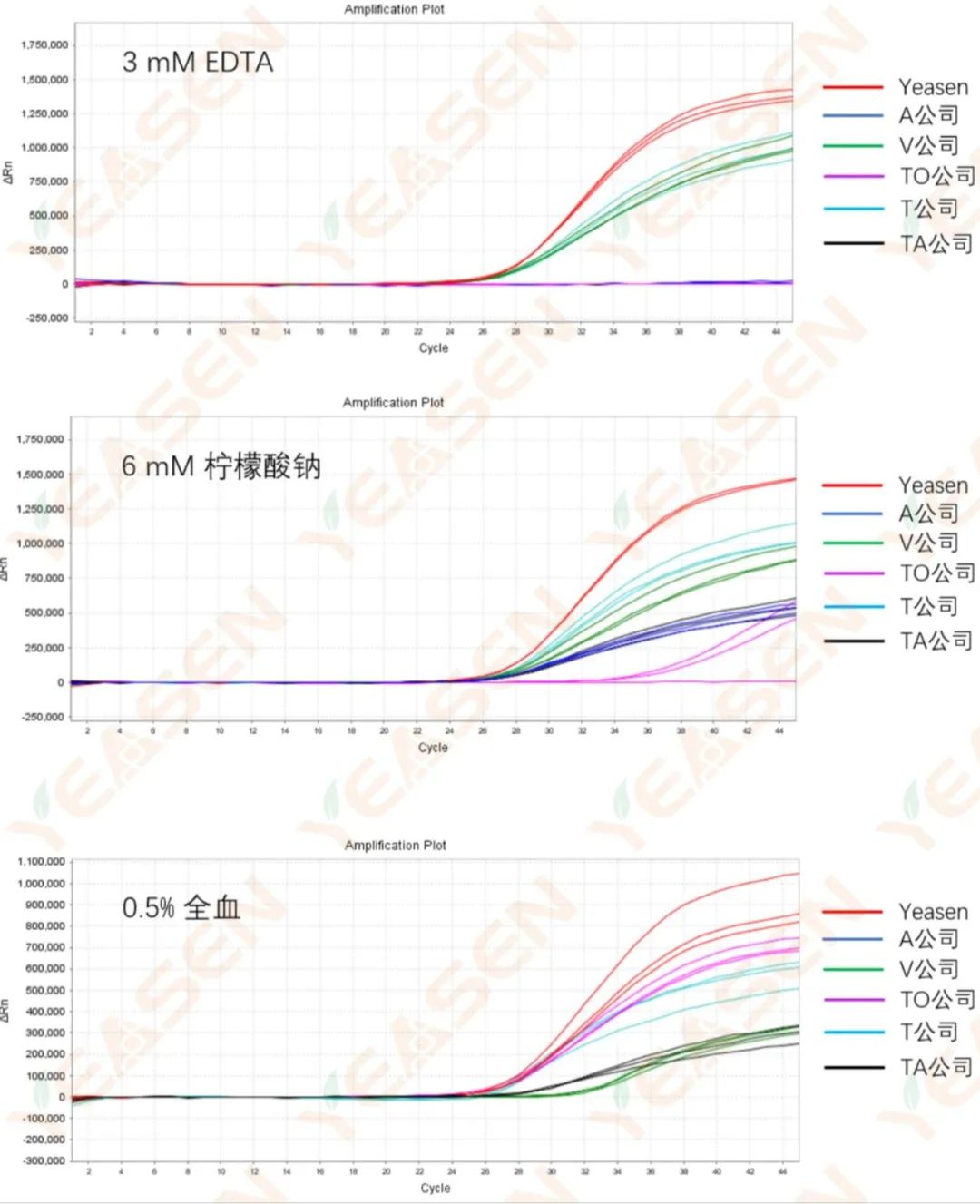 分别检测Yeasen 探针法qPCR Mix及各品牌qPCR试剂对血液样本中抑制物的耐受性,结果发现,对于EDTA、柠檬酸钠,Yeasen 探针法qPCR Mix显示有很高的耐受性,且可以耐0.5%的全血。