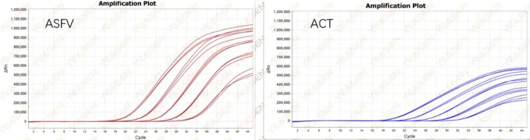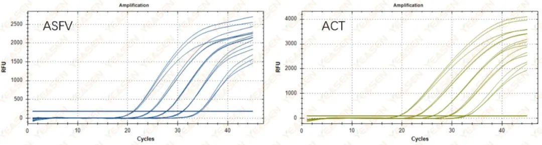 分别使用Yeasen 探针法qPCR Mix在Bio-Rad CFX96、ABI Q5及Slan平台上对非洲猪瘟ASFV/ACT双质粒进行扩增,可以看到Yeasen qPCR Mix适配各种机型的仪器,且数据可靠稳定。